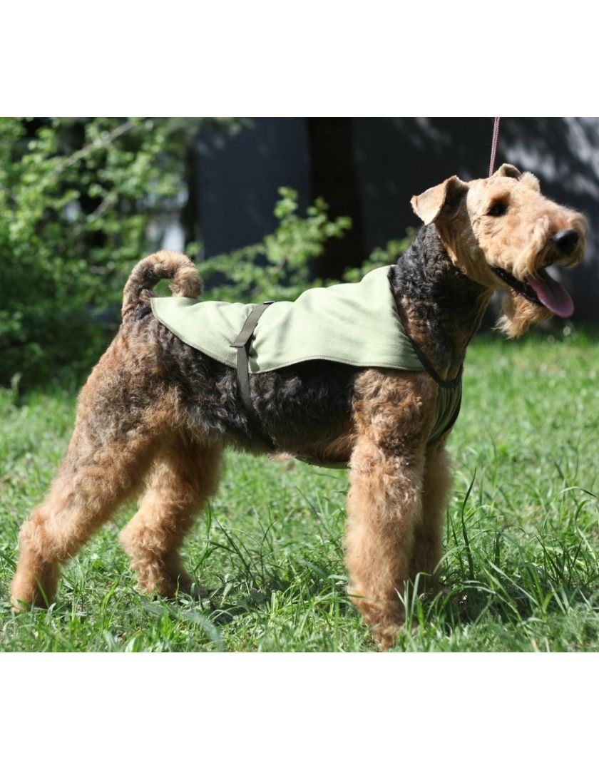 Попона сшита из двух частей, прикрывающих ― и охлаждающих ― спину и грудь собаки, спереди попона собрана на резинку для комфортной посадки по корпусу, на талии затягивается резинкой с застежкой фастекс, что позволяет фиксировать обе части попоны на корпусе и регулировать размер.