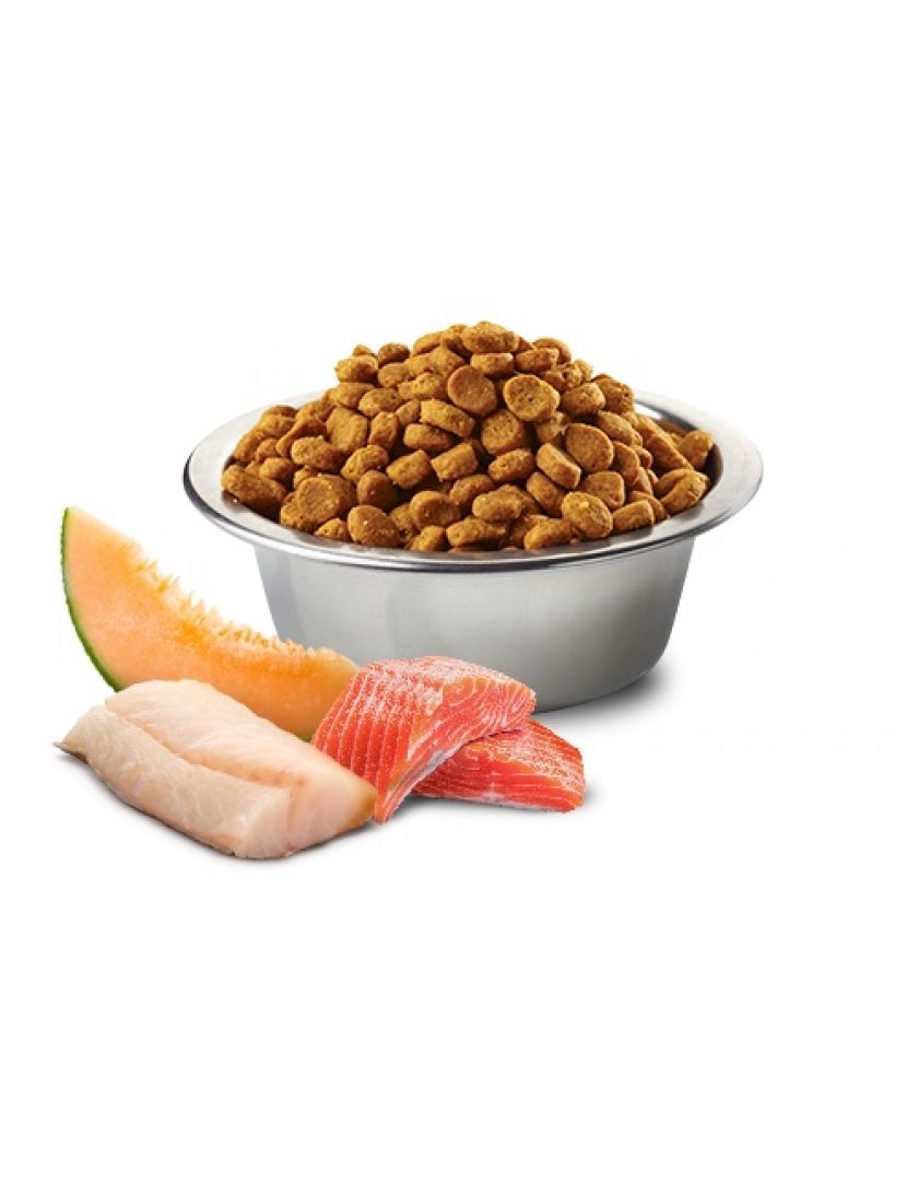 Лосось (20%), дегидратированный белок лосося (20%), сладкий картофель, треска (10%), дегидратированный белок трески (10%), рыбий жир (сельдь), дегидратированный белок сельди, гороховая клетчатка, сушеная морковь, люцерновая мука, инулин, фруктоолигосахариды, экстракт дрожжей (источник манноолигосахаридов), сушеная дыня (0.5%), сушеная черника, сушеное яблоко, сушеный шпинат, шелуха семян и семена подорожника, сушеный гранат, хлорид натрия, хлорид калия, сухие пивные дрожжи, куркума (0.2%), экстракт алоэ вера, глюкозамин, хондроитин сульфат.