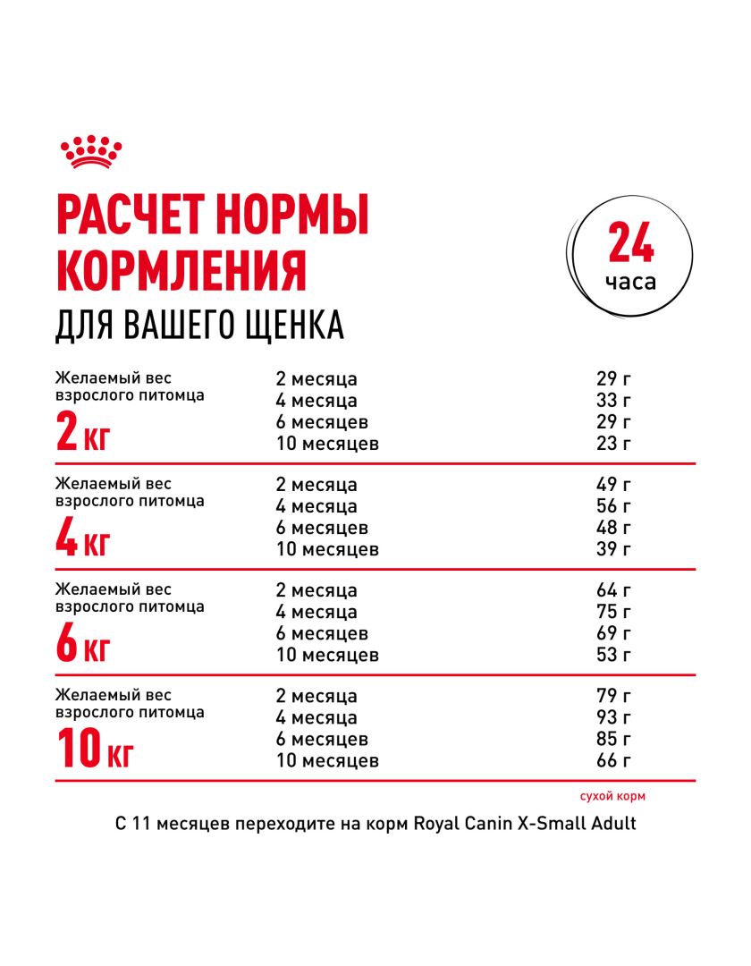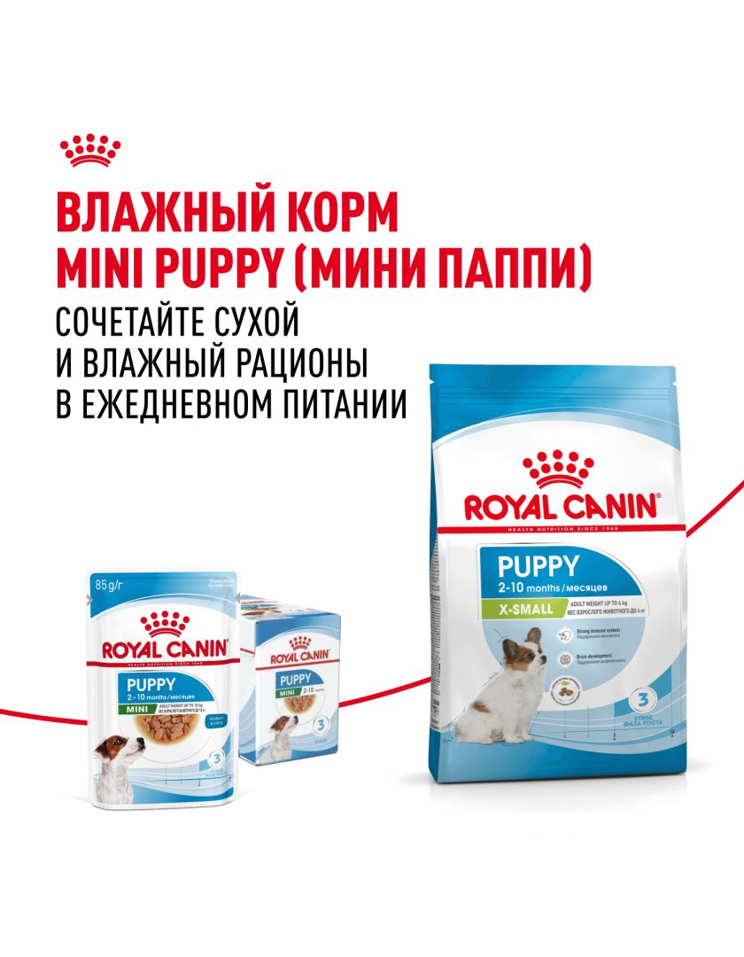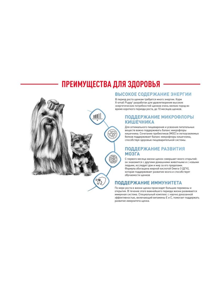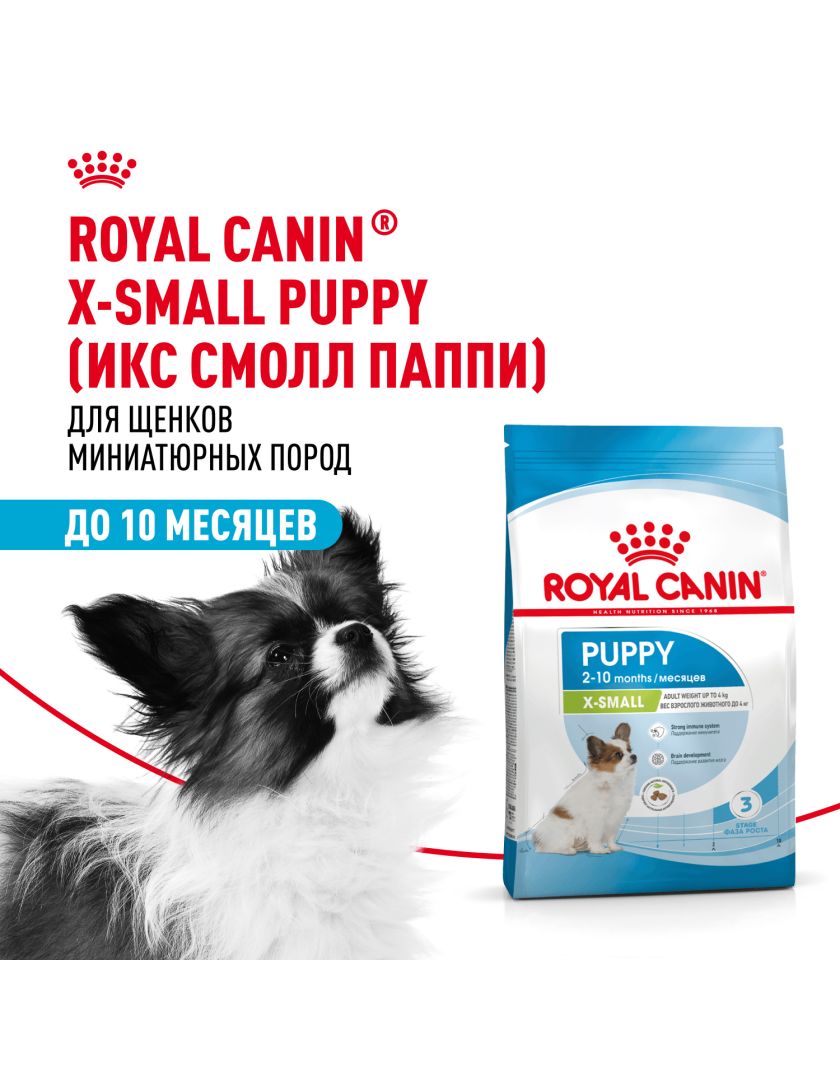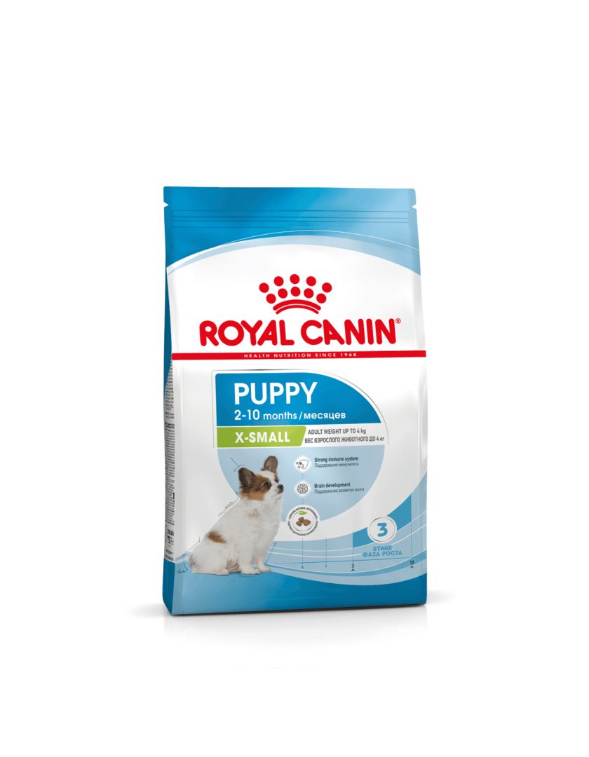 Корм сухой полнорационный для щенков миниатюрных пород (вес взрослой собаки до 4 кг) в возрасте до 10 месяцев X-SMALL PUPPY 2-10 months (ИКС СМОЛЛ ПАППИ 2-10 месяцев) ROYAL CANIN®, подходящий для щенков миниатюрных пород в возрасте до 10 месяцев, специально разработан с учетом потребностей в питательных веществах вашего щенка в период роста.