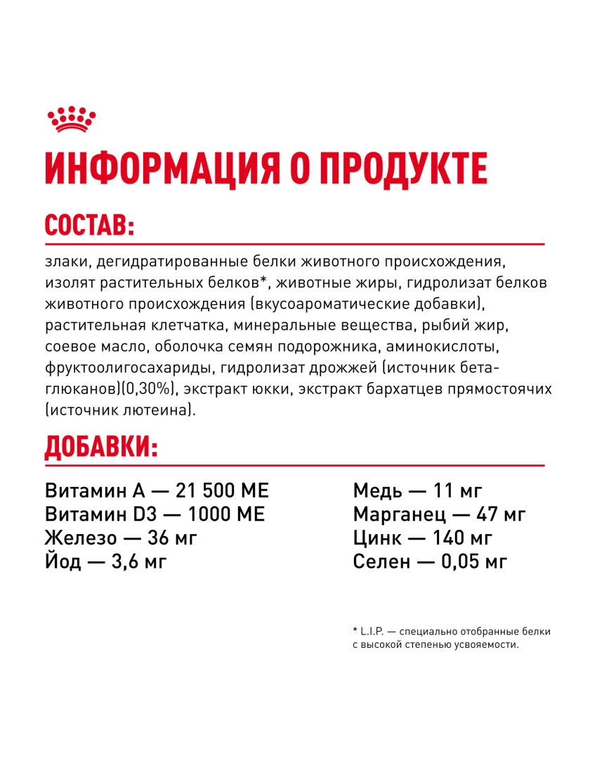 ИНГРЕДИЕНТЫ: злаки, дегидратированные белки животного происхождения, изолят растительных белков*, животные жиры, гидролизат белков животного происхождения (вкусоароматические добавки), растительная клетчатка, минеральные вещества, рыбий жир, соевое масло, оболочка семян подорожника, аминокислоты, фруктоолигосахариды, гидролизат дрожжей (источник бета-глюканов)(0.30%), экстракт юкки, экстракт бархатцев прямостоячих (источник лютеина).