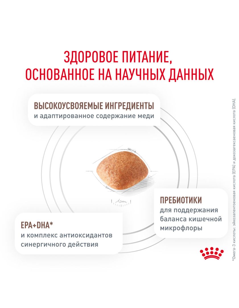 СОДЕРЖАНИЕ ПИТАТЕЛЬНЫХ ВЕЩЕСТВ: Белки: 16,0 % - Жиры: 16,0 % - Минеральные вещества: 4,6 % - Клетчатка пищевая: 1,6 % - Углеводы: 52,3 % - Медь: 3,0 мг/кг - EPA/DHA: 0,20 %. Обменная энергия: 3935 ккал/кг.