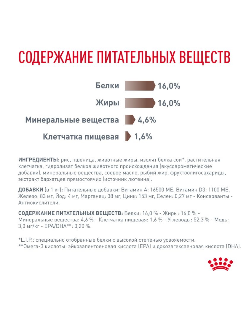 ИНГРЕДИЕНТЫ: рис, пшеница, животные жиры, изолят белка сои*, растительная клетчатка, гидролизат белков животного происхождения (вкусоароматические добавки), минеральные вещества, соевое масло, рыбий жир, фруктоолигосахариды, экстракт бархатцев прямостоячих (источник лютеина). *L.I.P.: специально отобранные белки с высокой степенью усвояемости.