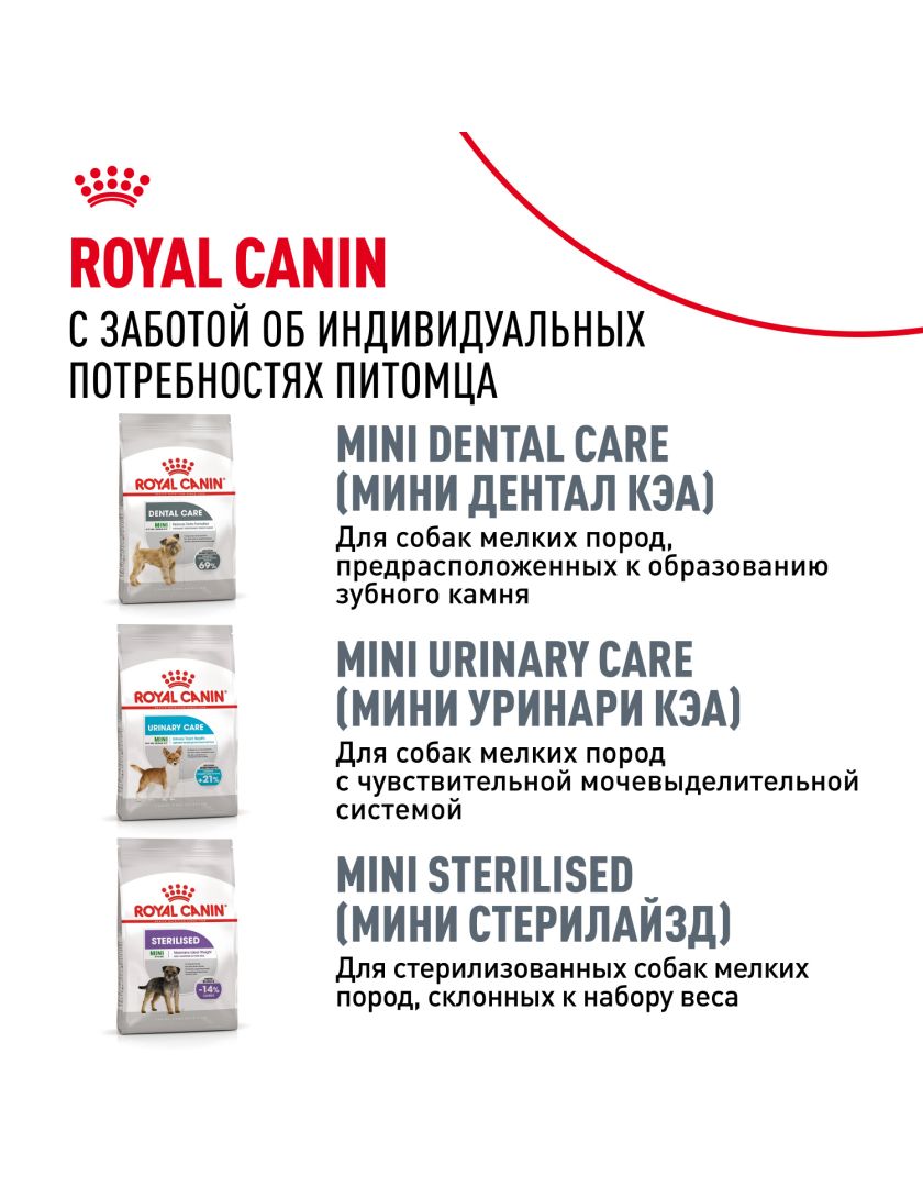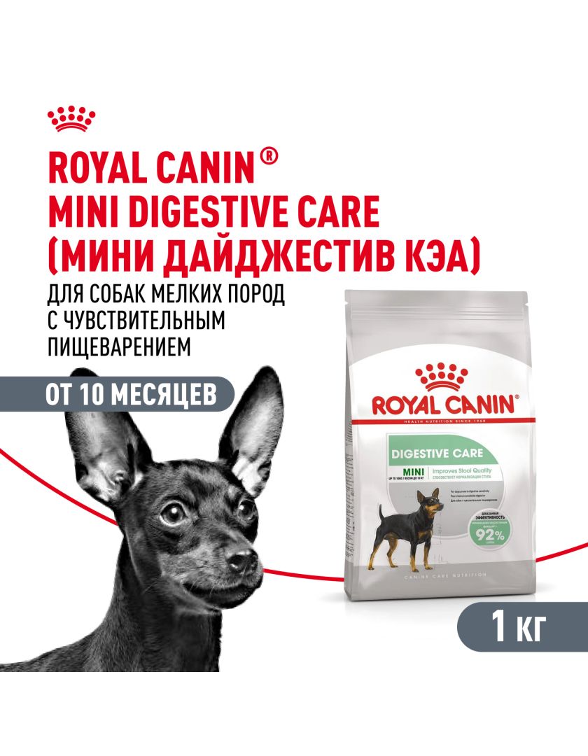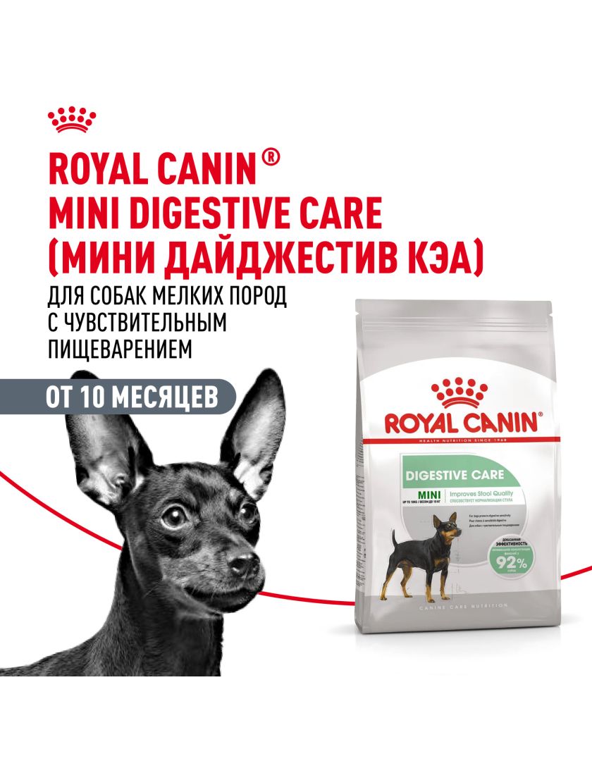 Корм сухой полнорационный для взрослых и стареющих собак мелких размеров (весом от 1 до 10 кг) в возрасте 10 месяцев и старше, с чувствительным пищеварением MINI DIGESTIVE CARE (МИНИ ДАЙДЖЕСТИВ КЭА) ROYAL CANIN®, подходящий для собак мелких размеров с чувствительной пищеварительной системой в возрасте от 10 месяцев и старше, специально разработан с учетом потребностей вашей собаки в питательных веществах.