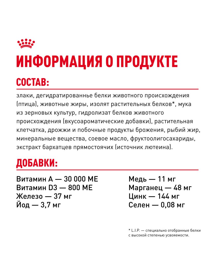 ИНГРЕДИЕНТЫ: злаки, дегидратированнье белки животного происхождения (птица), животные жиры, изолят растительных белков*, мука из зерновых культур, гидролизат белков животного происхождения (вкусоароматические добавки), растительная клетчатка, дрожжи и побочные продукты брожения, рыбий жир, минеральные вещества, соевое масло, фрукто-олиго-сахариды, экстракт бархатцев прямостоячих (источник лютеина).