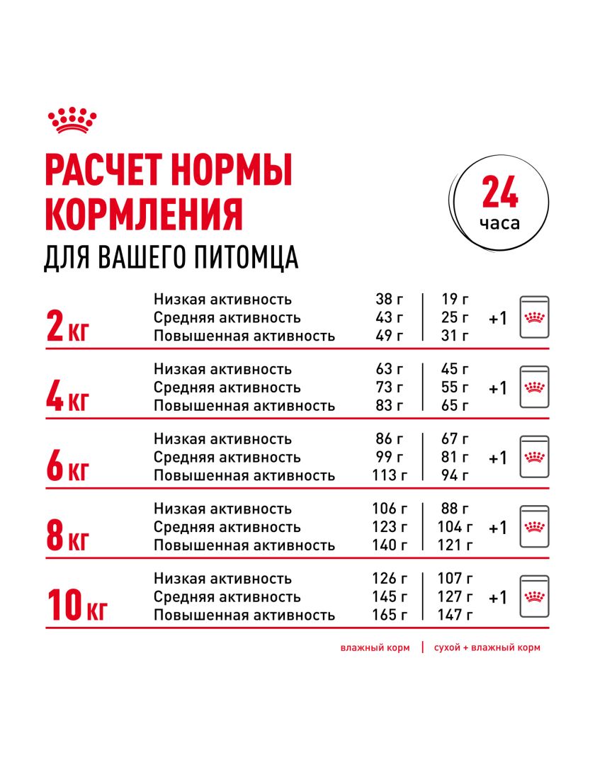 см. таблицу. Корм готов к употреблению. Проследите, чтобы у вашей собаки всегда была свежая вода. Номер серии и срок годности указаны на упаковке.