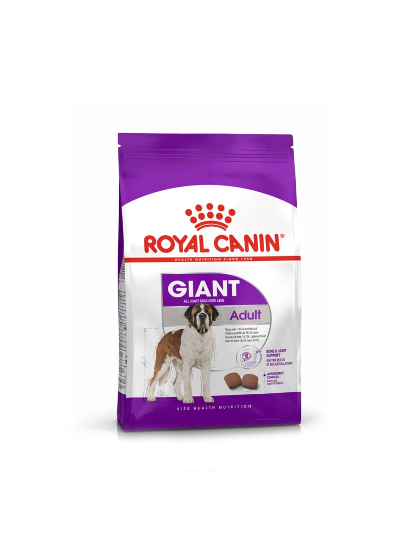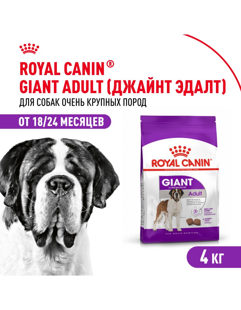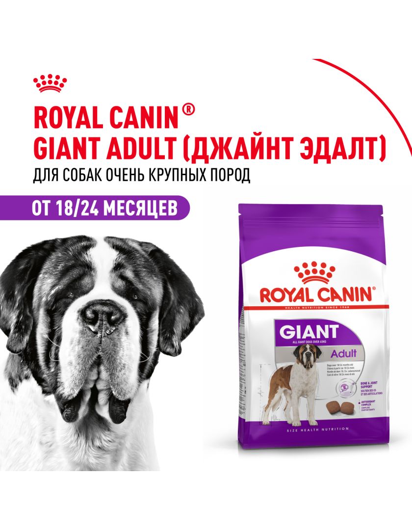 Корм сухой полнорационный для взрослых собак очень крупных размеров (> 45 кг) в возрасте 18/24 месяцев и старше GIANT ADULT (ДЖАЙНТ ЭДАЛТ) ROYAL CANIN®, подходящий для собак очень крупных пород в возрасте от 18/24 месяцев, специально разработан с учетом потребностей вашей собаки в питательных веществах.