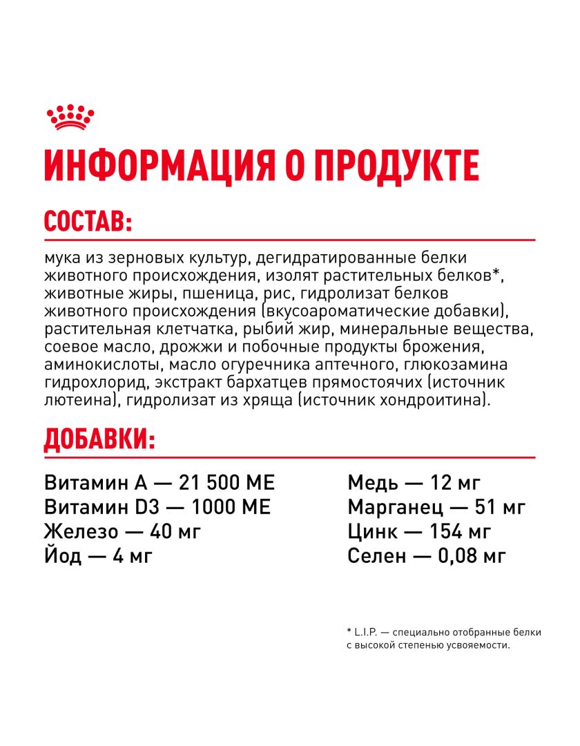 ИНГРЕДИЕНТЫ: мука из зерновых культур, дегидратированные белки животного происхождения, изолят растительных белков*, животные жиры, пшеница, рис, гидролизат белков животного происхождения (вкусоароматические добавки), растительная клетчатка, рыбий жир, минеральные вещества, соевое масло, дрожжи и побочные продукты брожения, аминокислоты, масло огуречника аптечного, глюкозамина гидрохлорид, экстракт бархатцев прямостоячих (источник лютеина), гидролизат из хряща (источник хондроитина).
