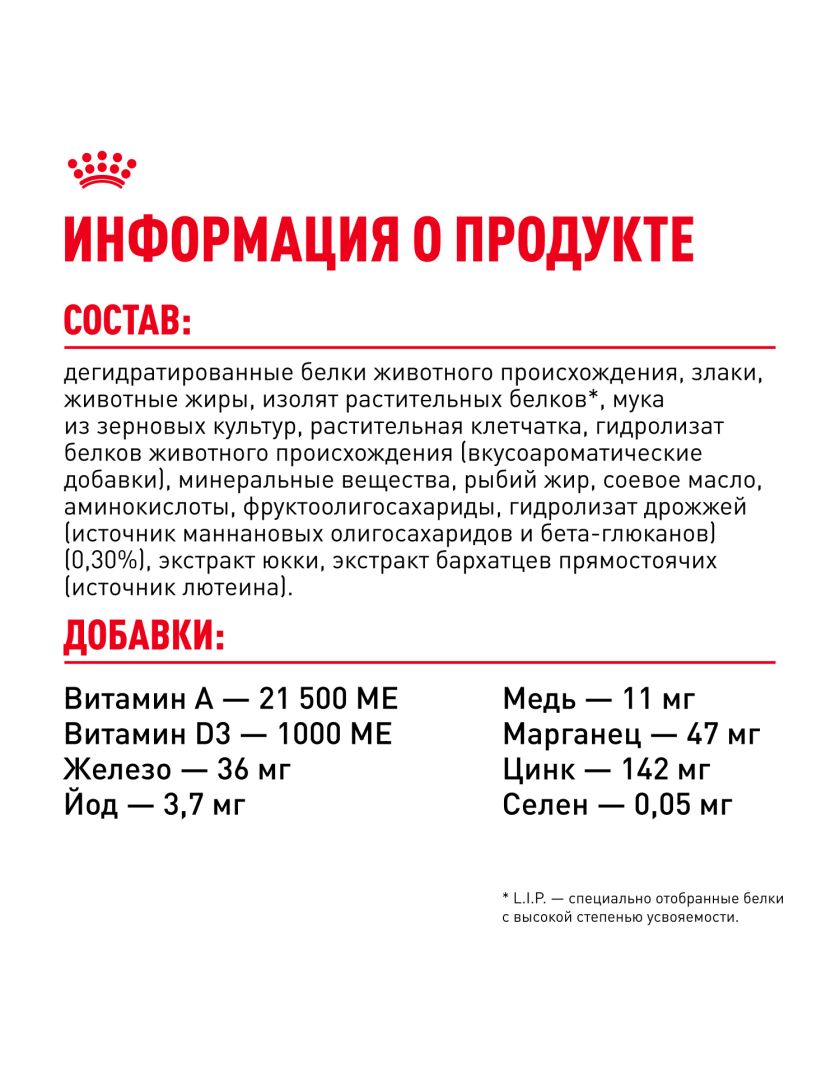 ИНГРЕДИЕНТЫ: дегидратированные белки животного происхождения, злаки, животные жиры, изолят растительных белков*, мука из зерновых культур, растительная клетчатка, гидролизат белков животного происхождения (вкусоароматические добавки), минеральные вещества, рыбий жир, соевое масло, аминокислоты, фруктоолигосахариды, гидролизат дрожжей (источник мaннановых олигосахаридов и бета-глюканов) (0,30 %), экстракт юкки, экстракт бархатцев прямостоячих (источник лютеина).