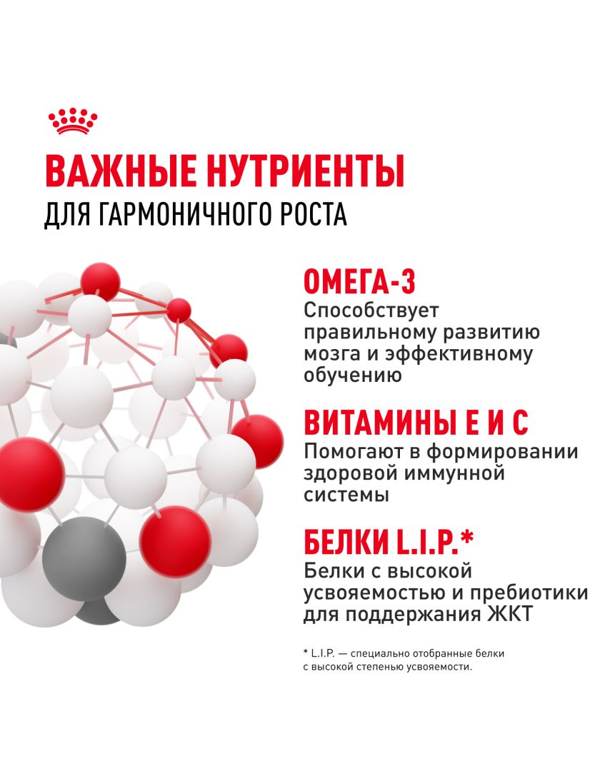 Формула обогащена жирной кислотой Омега-3 (DHA), которая поддерживает развитие мозга и способствует обучаемости щенков.