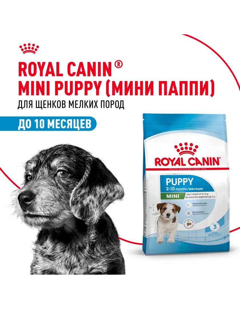 Корм сухой полнорационный для щенков мелких пород (вес взрослой собаки до 10 кг) в возрасте до 10 месяцев MINI PUPPY 2-10 months (МИНИ ПАППИ 2-10 месяцев) ROYAL CANIN®, подходящий для щенков мелких пород в возрасте до 10 месяцев, специально разработан с учетом потребностей в питательных веществах вашего щенка в период роста.