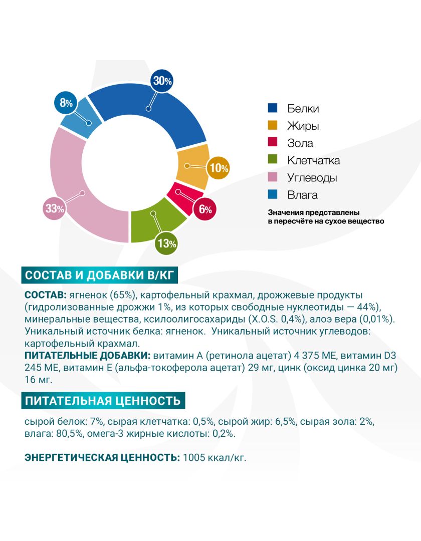 ПИТАТЕЛЬНЫЕ ДОБАВКИ /КГ: Витамин А (ретинола ацетат) 4 500 МЕ, витамин D3 252 МЕ, витамин Е (альфа-токоферола ацетат) 30 мг, цинк (оксид цинка 20 мг) 16 мг. Ингредиенты Ягненок (65%), картофельный крахмал, дрожжевые продукты (гидролизованные дрожжи 1%, из которых свободные нуклеотиды 44%), минеральные вещества, ксилоолигосахариды (X.O.S. 0,4%), алоэ вера (0,01%).