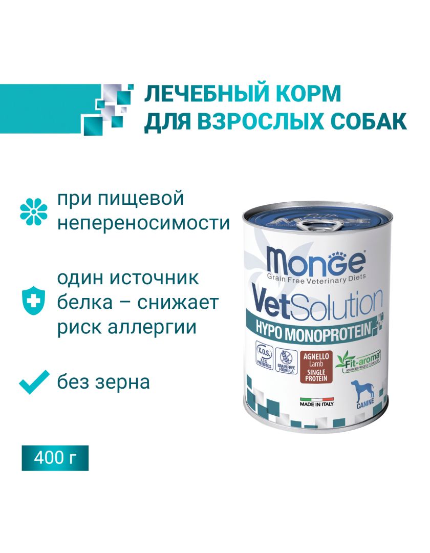 Диетические консервы для собак Monge VetSolution Dog Hypo Monoprotein LAMB Гипо монопротеиновый, снижения реакции пищевой непереносимости, с ягнёнком