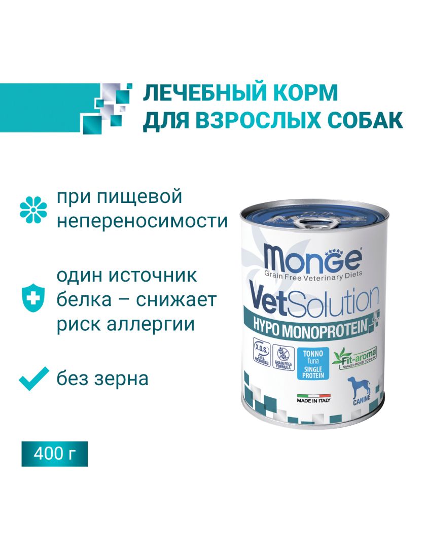 MONGE VETSOLUTION Dog HYPO MONOPROTEIN TUNA влажная диета для собак Гипо монопротеин с тунцом 400 г.