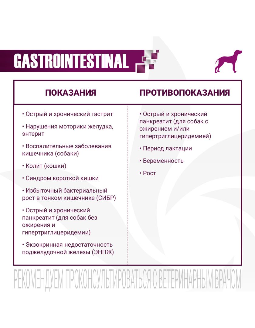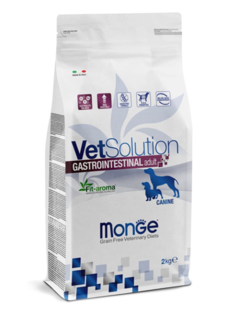 Лечебный корм Monge (Монж) VetSolution Dog Gastrointestinal для собак Гастроинтестинал при заболеваниях желудочно-кишечного тракта, таких как острый и хронический гастрит, расстройства моторики желудка энтерит и воспалительные заболевания кишечника, энтеропатии с потерей белка, синдром короткой кишки и избыточный бактериальный рост в тонком отделе кишечника, колит, а так же при остром и хроническом панкреатите (для собак, НЕ страдающих ожирением и гипертриглицеридемией).