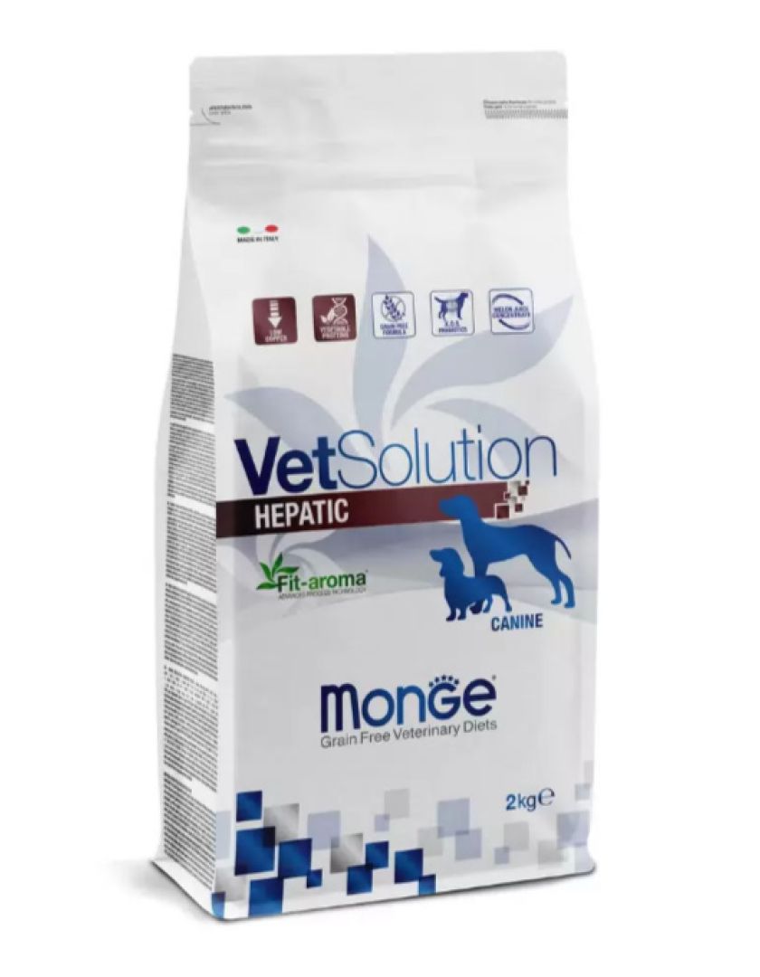 Monge (Монж/Монже) VetSolution Hepatic — полнорационный сухой диетический корм для собак «Hepatic» для поддержания функции печени у собак при хронической печеночной недостаточности и снижения накопления меди в печени. Содержит концентрат сока дыни для нейтрализации свободных радикалов.