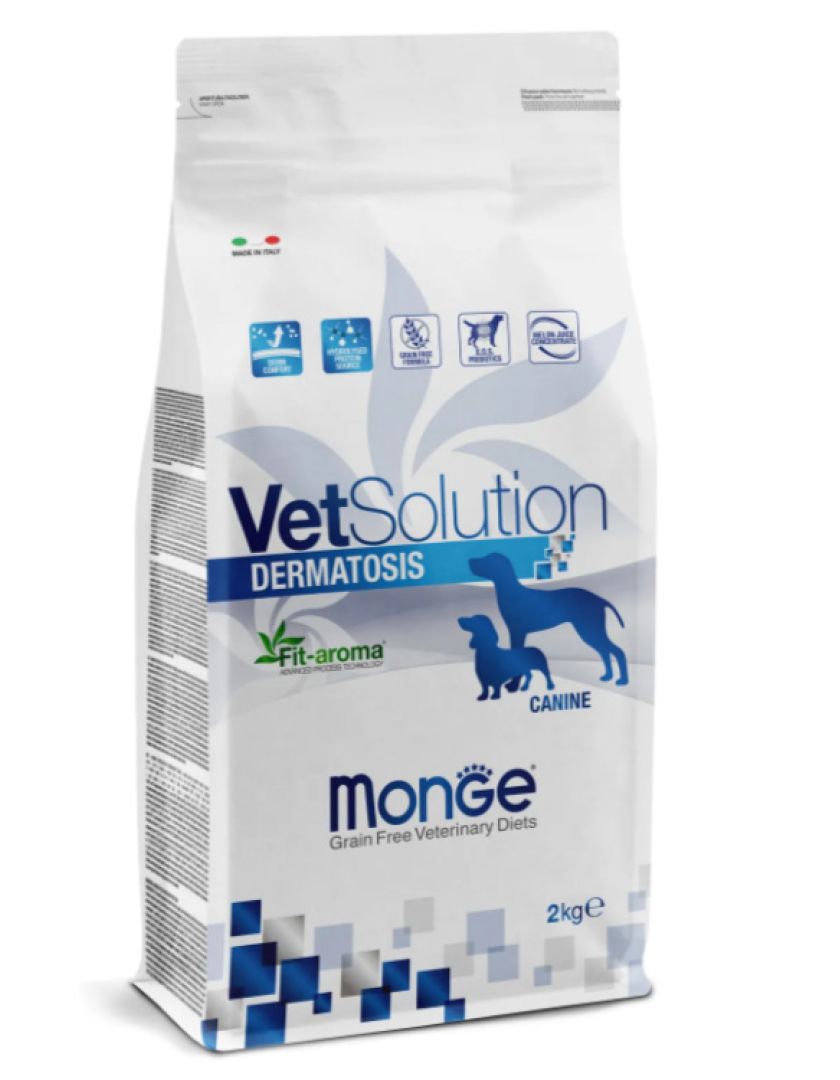 Monge VetSolution Dermatosis - полнорационный сухой диетический корм из лосося для собак «DERMATOSIS» для восстановления функций кожи при дерматологических заболеваниях и избыточном выпадении шерсти у собак. Содержит концентрат сока дыни для нейтрализации свободных радикалов.