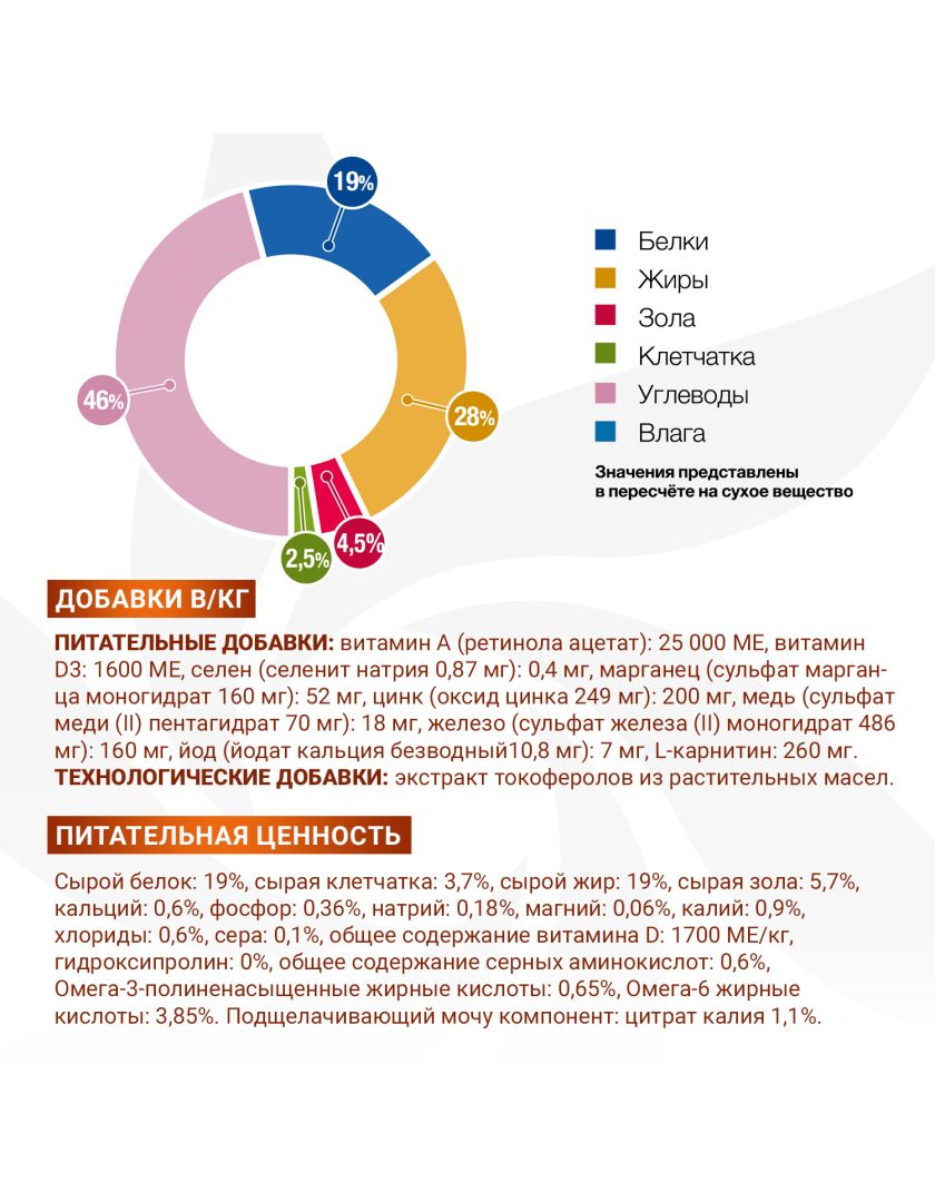 Питательная ценность: сырой белок: 19%, сырая клетчатка: 3,7%, сырой жир: 19%, сырая зола: 5,7%, кальций: 0,6%, фосфор: 0,36%, натрий: 0,18%, магний: 0,06%, калий: 0,9%, хлориды: 0,6%, сера: 0,1%, общее содержание витамина D: 1700 МЕ/кг, гидроксипролин: 0%, общее содержание серных аминокислот: 0,6%, Омега-3 жирные кислоты: 0,65%, Омега-6 жирные кислоты: 3,85%. Подщелачивающий мочу компонент: цитрат калия 1,1%.