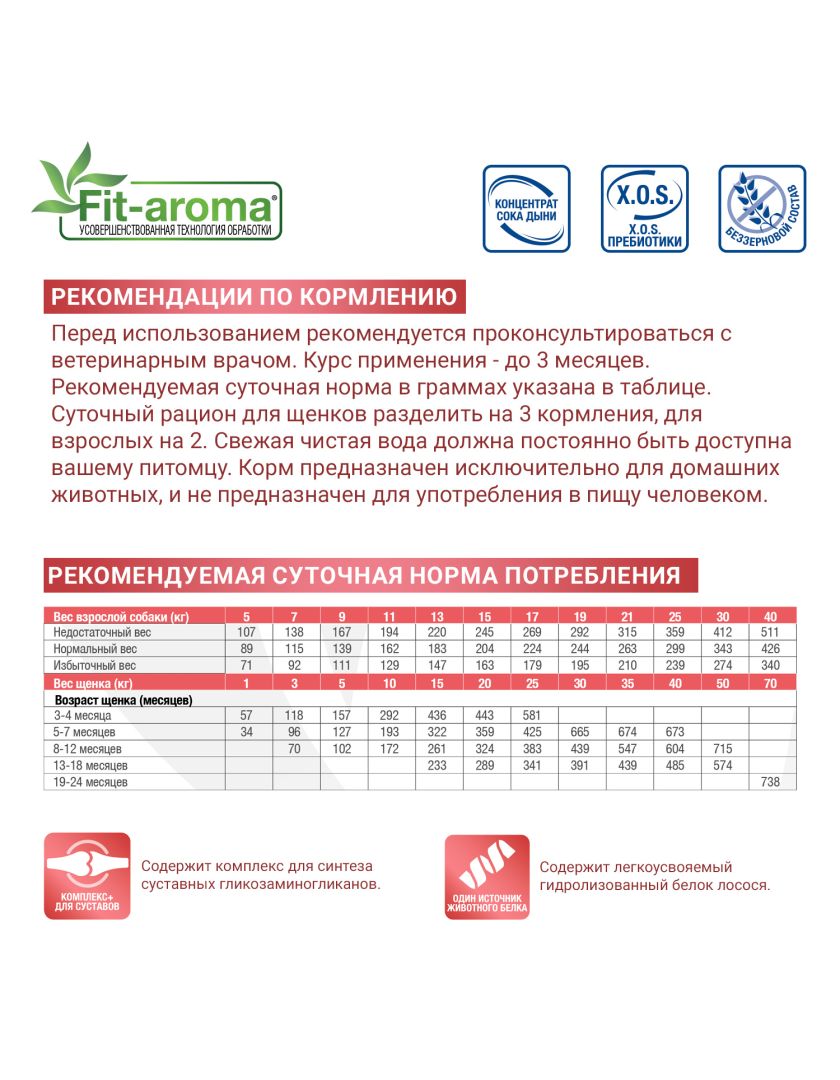 Состав Гидролизованный белок лосося, тапиока, картофель, рыбий жир (лососевый жир 7%)*, животный жир (утиный жир)*, сухая свекольная пульпа, гидролизованный животный белок, минеральные вещества, пивные дрожжи, гороховая клетчатка, ксилоолигосахариды (XOS 0,4%), продукты переработки растений (босвеллия (Boswellia serrata) 0,23%), глюкозамин (0,057%), хондроитина сульфат (0,04%), продукты и субпродукты переработки свежих фруктов и овощей (концентрат сока дыни (Cucumis melo cantalupensis) источник супероксиддисмутазы 0,005%). *очищенный на 99,6%, консервированный с помощью натуральных антиоксидантов.