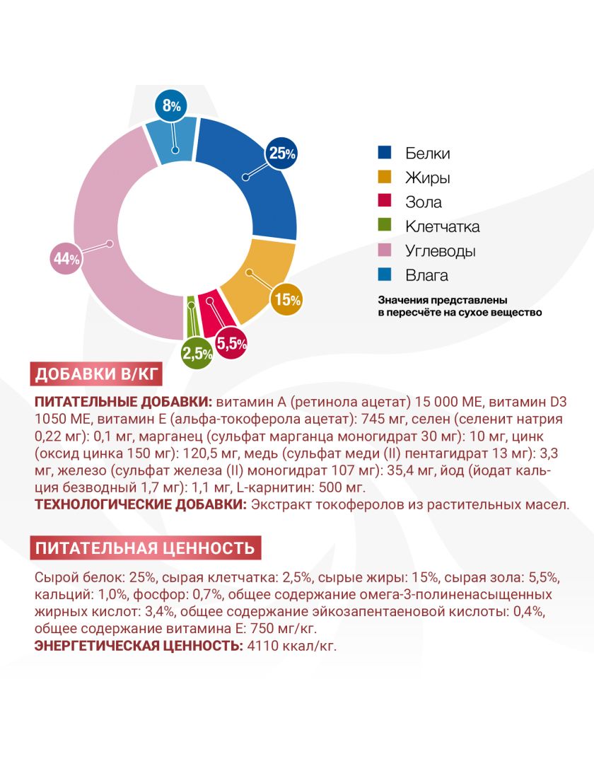 Питательная ценность: сырой белок 25%, сырая клетчатка 2,5%, сырые жиры 15%, сырая зола 5,5%, кальций 1,0%, фосфор 0,7%, общее содержание жирных омега-3 кислот 3,4%, общее содержание эйкозапентаеновой кислоты 0,4%, общее содержание витамина E 750 мг/кг.