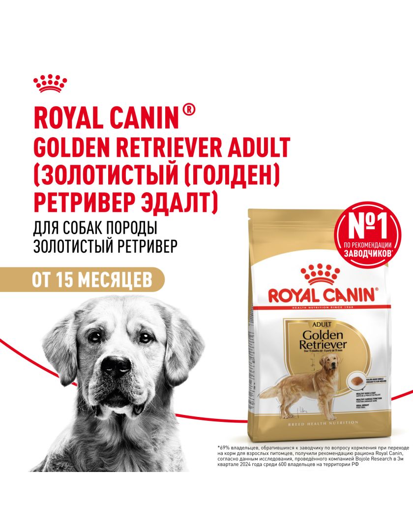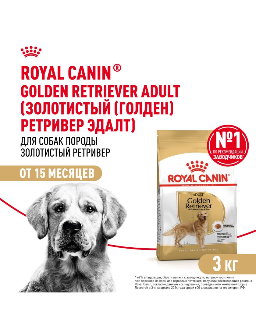 Корм сухой полнорационный для взрослых собак породы золотистый (голден) ретривер в возрасте 15 месяцев и старше GOLDEN RETRIEVER ADULT (ЗОЛОТИСТЫЙ (ГОЛДЕН) РЕТРИВЕР ЭДАЛТ) ROYAL CANIN®, подходящий для собак породы голден-ретривер в возрасте от 15 месяцев, специально разработан с учетом потребностей вашей собаки в питательных веществах.