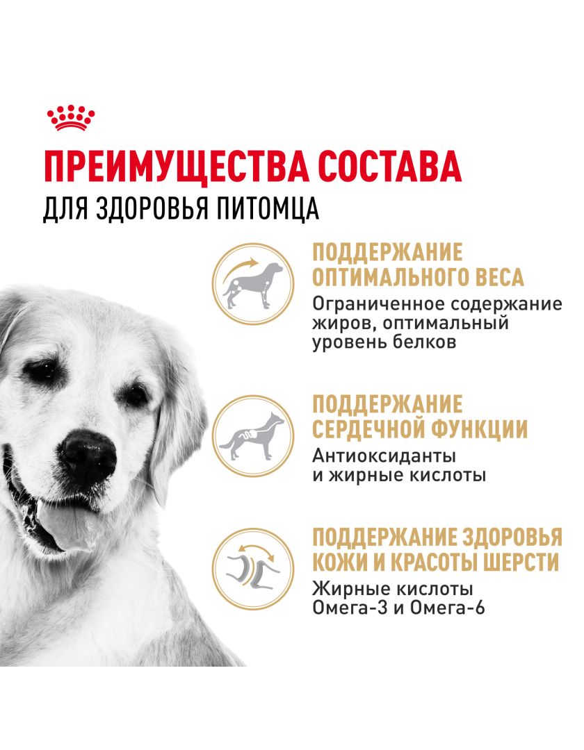 Формула сухого продукта ROYAL CANIN® Golden Retriever Adult (ЗОЛОТИСТЫЙ (ГОЛДЕН) РЕТРИВЕР ЭДАЛТ) поддерживает здоровье кожи и красоту шерсти, помогает защите организма на клеточном уровне и сохранению оптимального веса, а также поддерживает сердечную функцию собаки.