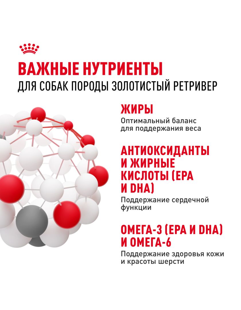 ROYAL CANIN® Golden Retriever Adult (ЗОЛОТИСТЫЙ (ГОЛДЕН) РЕТРИВЕР ЭДАЛТ) поддерживает здоровье сердца вашей собаки благодаря комбинации антиоксидантов и жирных кислот (EPA и DHA), позволяющих укрепить сердечную мышцу.