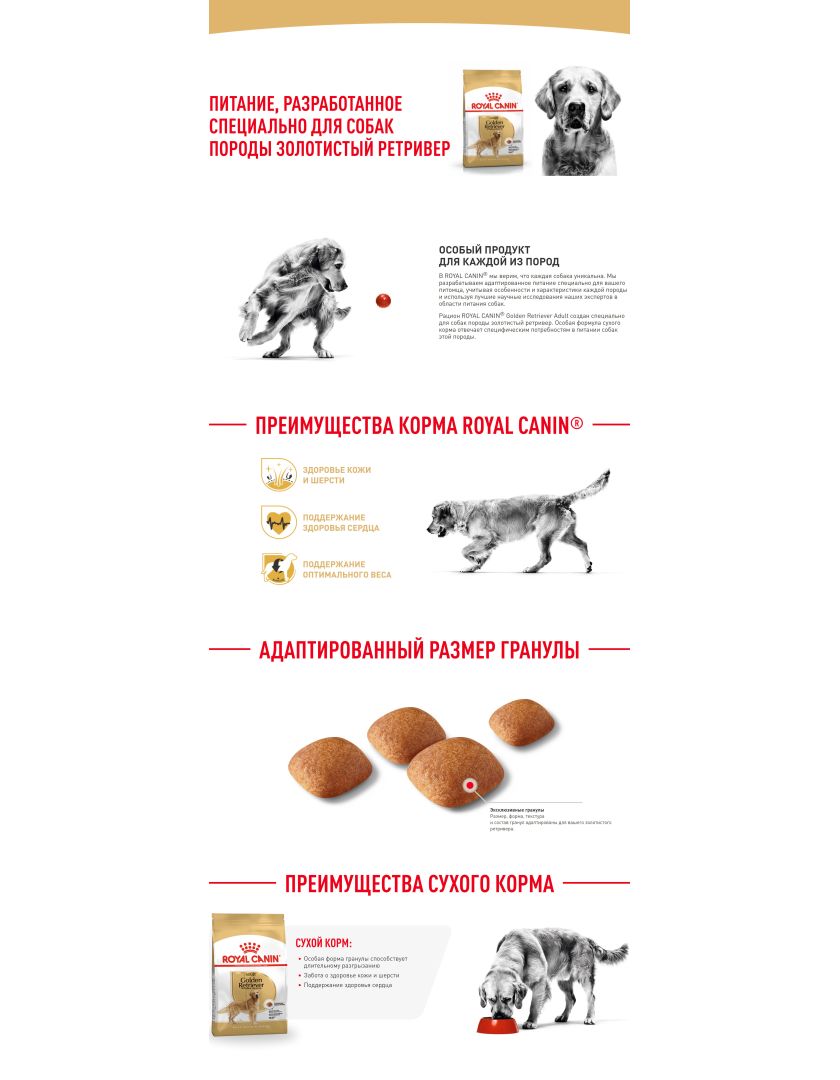 Гранулы ROYAL CANIN® Golden Retriever Adult (ЗОЛОТИСТЫЙ (ГОЛДЕН) РЕТРИВЕР ЭДАЛТ) форма, размер и текстура которых созданы специально для собак породы голден-ретривер.