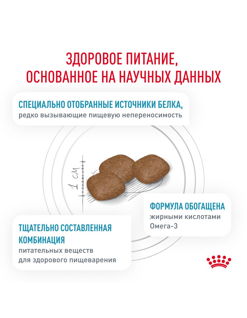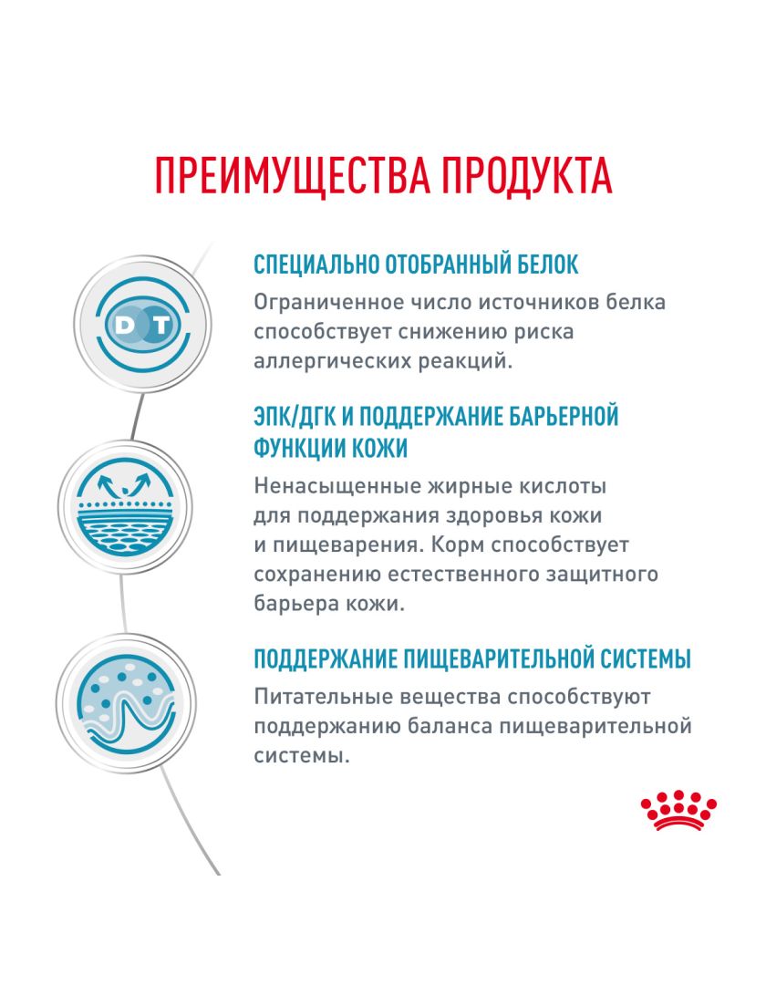 СПЕЦИАЛЬНО ОТОБРАННЫЙ БЕЛОК Ограниченное число источников белка способствует снижению риска аллергических реакций. ЭПК/ДГК И ПОДДЕРЖАНИЕ БАРЬЕРНОЙ ФУНКЦИИ КОЖИ Ненасыщенные жирные кислоты для поддержания здоровья кожи и пищеварения. Корм способствует сохранению естественного защитного барьера кожи ПОДДЕРЖАНИЕ ПИЩЕВАРИТЕЛЬНОЙ СИСТЕМЫ Питательные вещества способствуют поддержанию баланса пищеварительной системы.