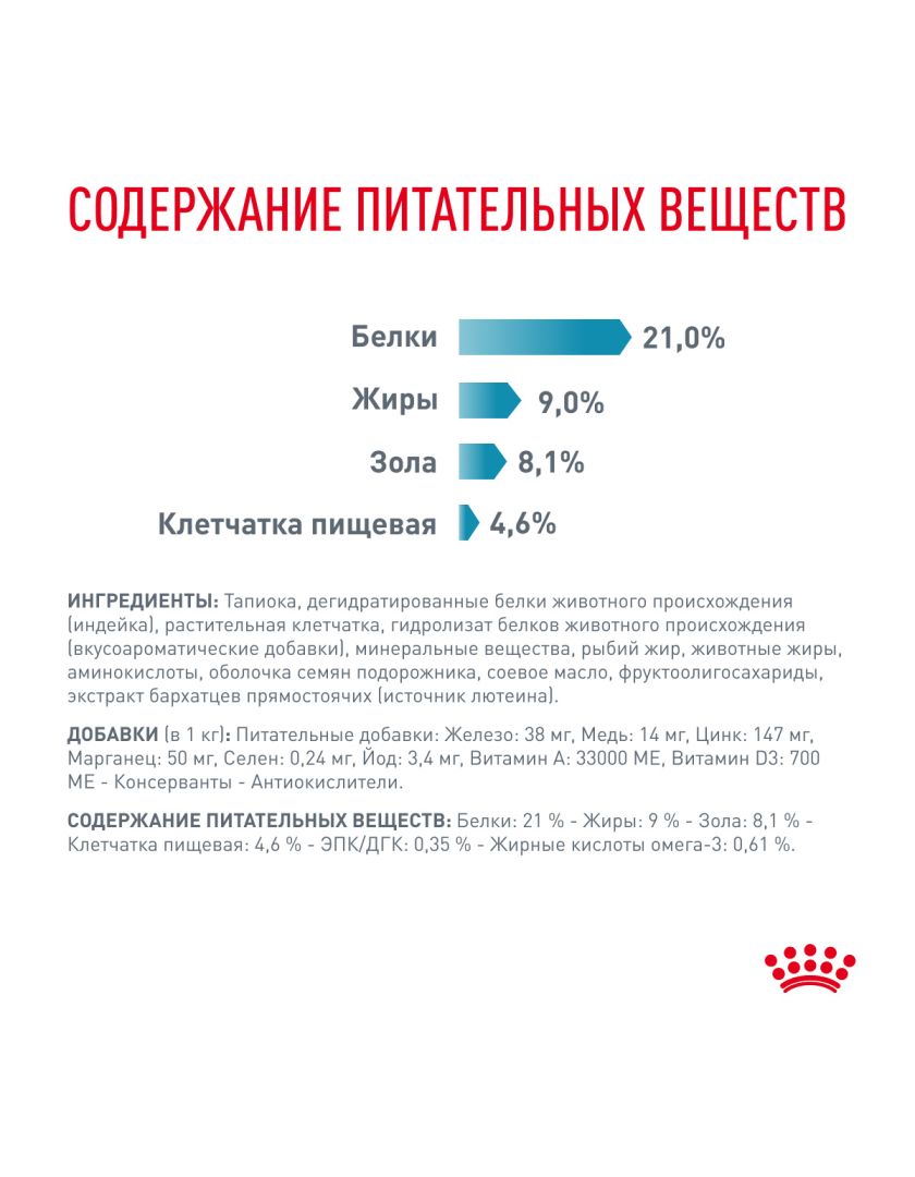 ИНГРЕДИЕНТЫ: Тапиока, дегидратированные белки животного происхождения (индейка), растительная клетчатка, гидролизат белков животного происхождения (вкусоароматические добавки), минеральные вещества, рыбий жир, животные жиры, аминокислоты, оболочкa семян подорожника, соевое масло, фруктоолигосахариды, экстракт бархатцев прямостоячих (источник лютеина).