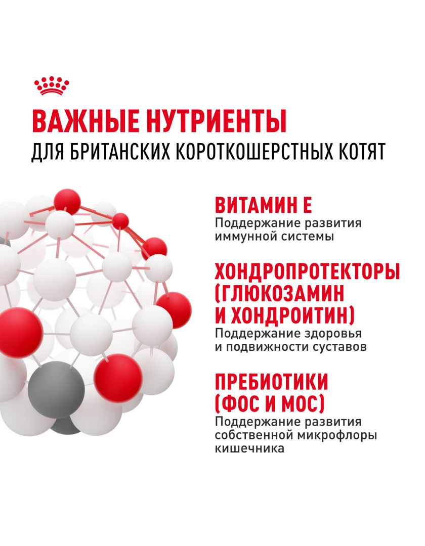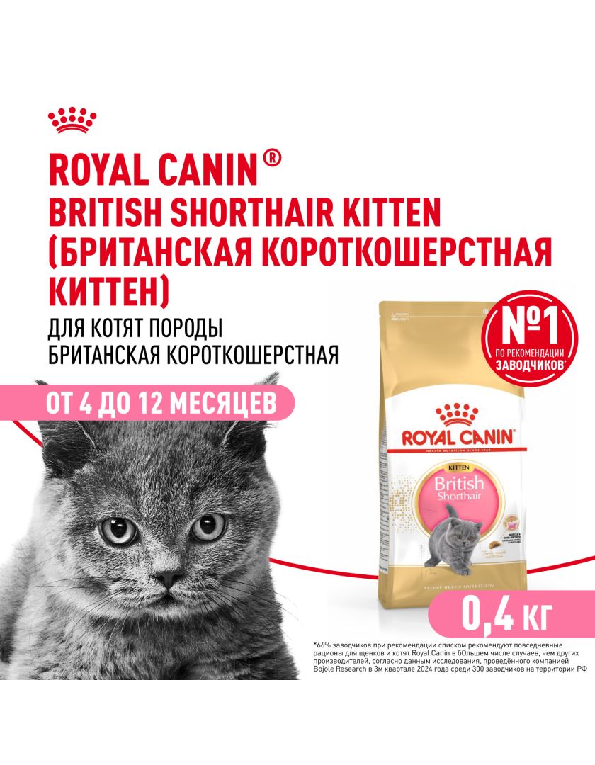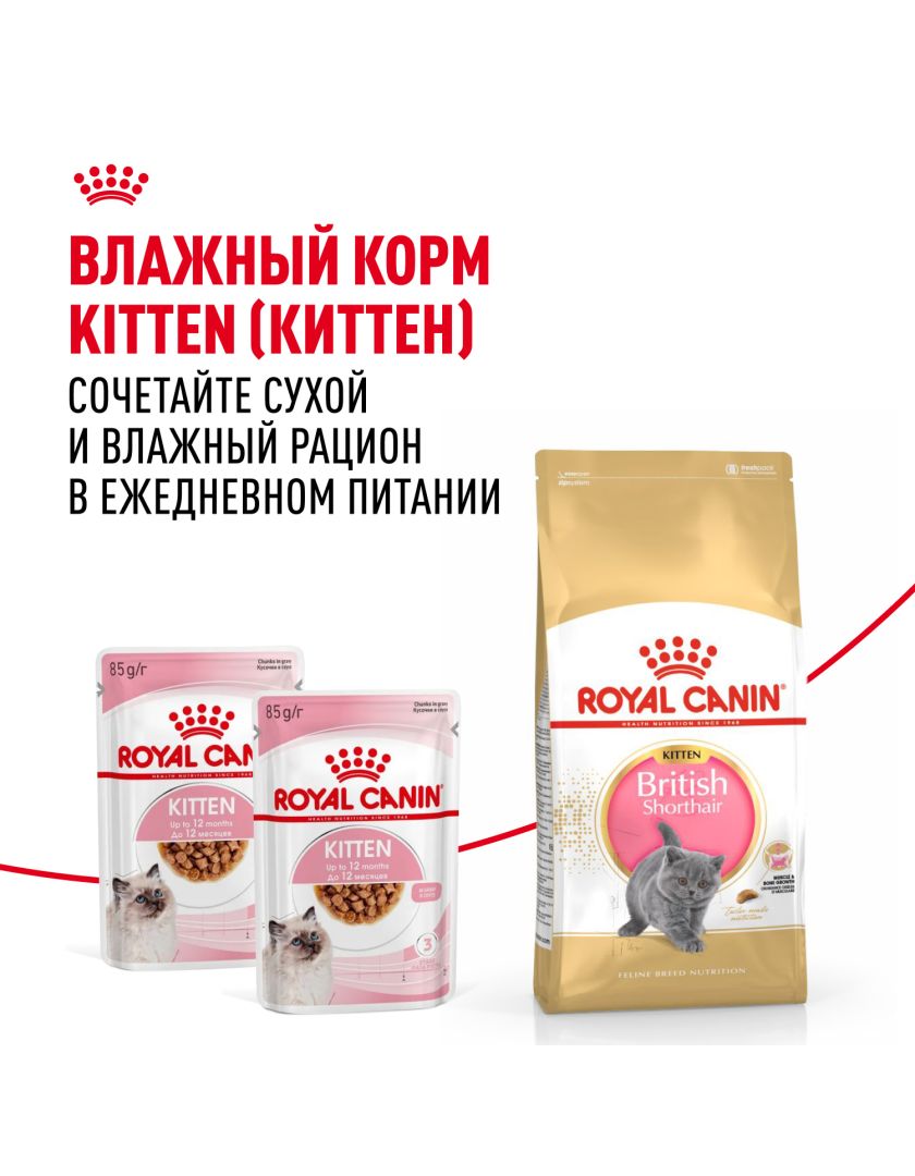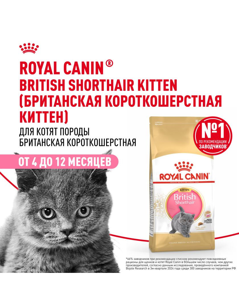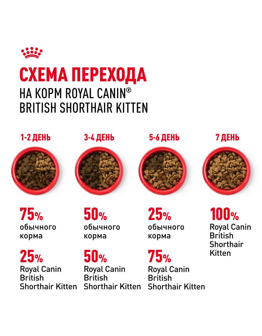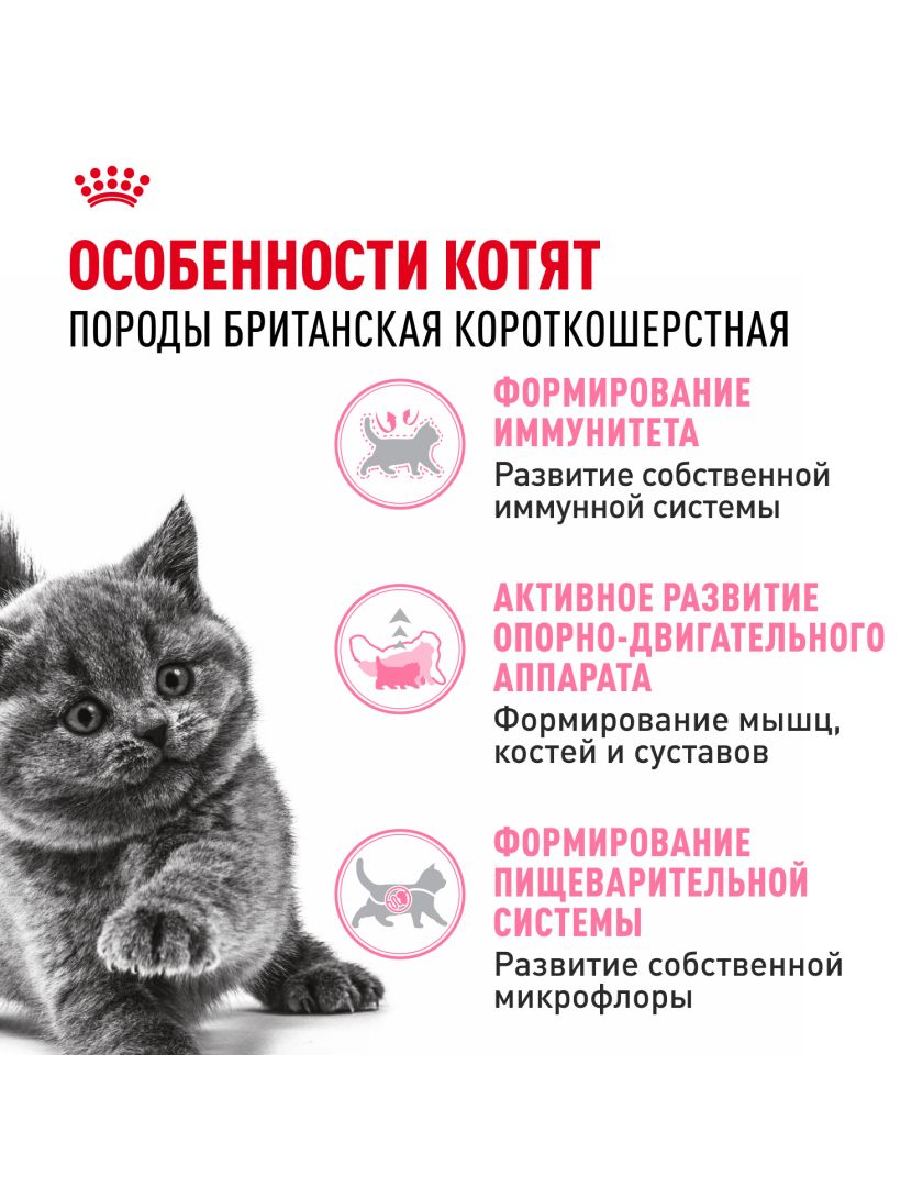 Корм сухой полнорационный сбалансированный для кошек - Специально для британских короткошерстных котят (в возрасте до 12 месяцев) BRITISH SHORTHAIR KITTEN (БРИТАНСКАЯ КОРОТКОШЕРСТНАЯ КИТТЕН) ROYAL CANIN®, подходящий для котят породы британская короткошерстная и шотландская вислоухая в возрасте от 4 до 12 месяцев, специально разработан с учетом потребностей вашего котенка в питательных веществах