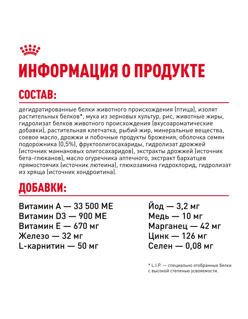 ИНГРЕДИЕНТЫ: дегидратированные белки животного происхождения (птица), изолят растительных белков*, мука из зерновых культур, рис, животные жиры, гидролизат белков животного происхождения (вкусоароматические добавки), растительная клетчатка, рыбий жир, минеральные вещества, соевое масло, дрожжи и побочные продукты брожения, оболочка семян подорожника (0,5%), фруктоолигосахариды, гидролизат дрожжей (источник маннановых олигосахаридов), экстракты дрожжей (источник бета-глюканов), масло огуречника аптечного, экстракт бархатцев прямостоячих (источник лютеина), глюкозамина гидрохлорид, гидролизат из хряща (источник хондроитина).