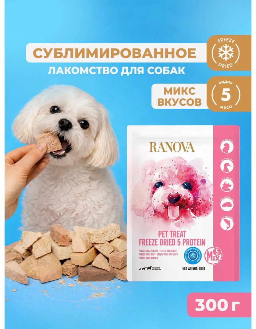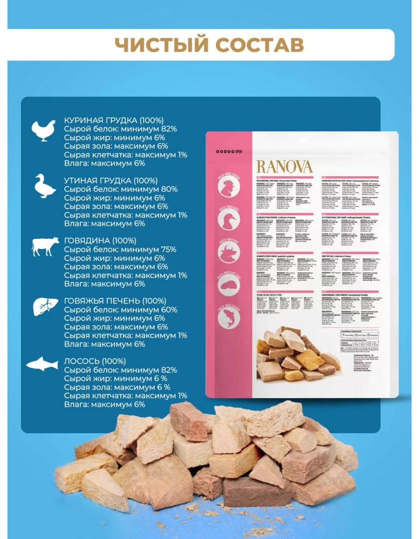 Лакомство для собак Ranova сублимированное Мясное ассорти: куриная грудка, утиная грудка, говядина, говяжья печень, лосось