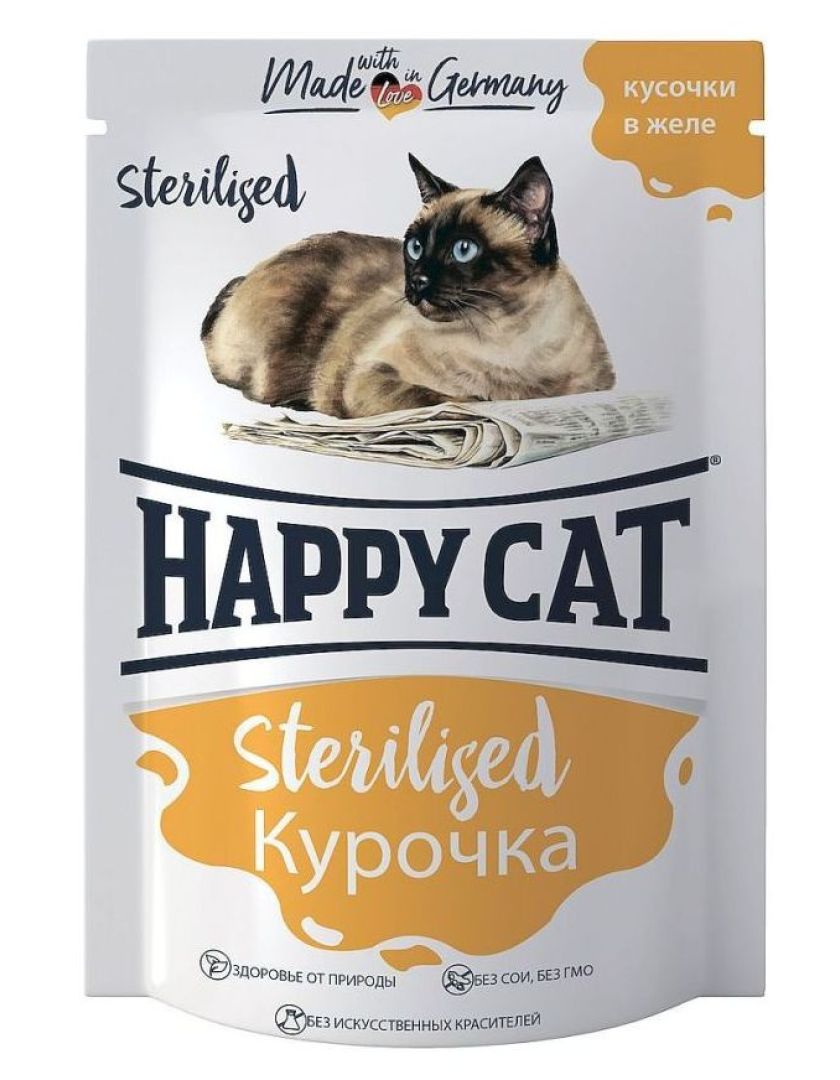Полноценный корм Хэппи Кэт Sterilised Курица кусочки в желе для стерилизованных кошек и кастрированных котов обеспечивает правильное и разнообразное питание. Умеренная калорийность корма поможет поддержать идеальный вес кошки.