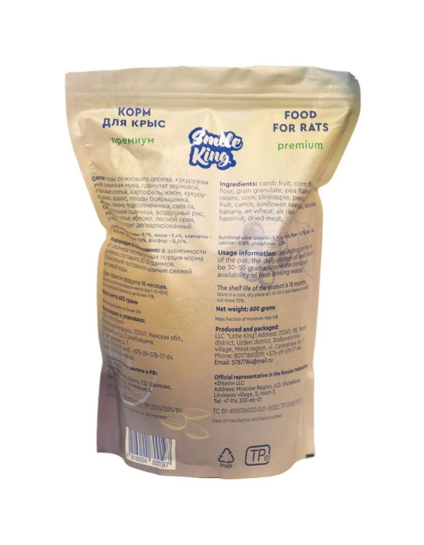 Полнорационный корм для крыс изготовлен в Беларуси из экологически чистого, отборного сырья.
