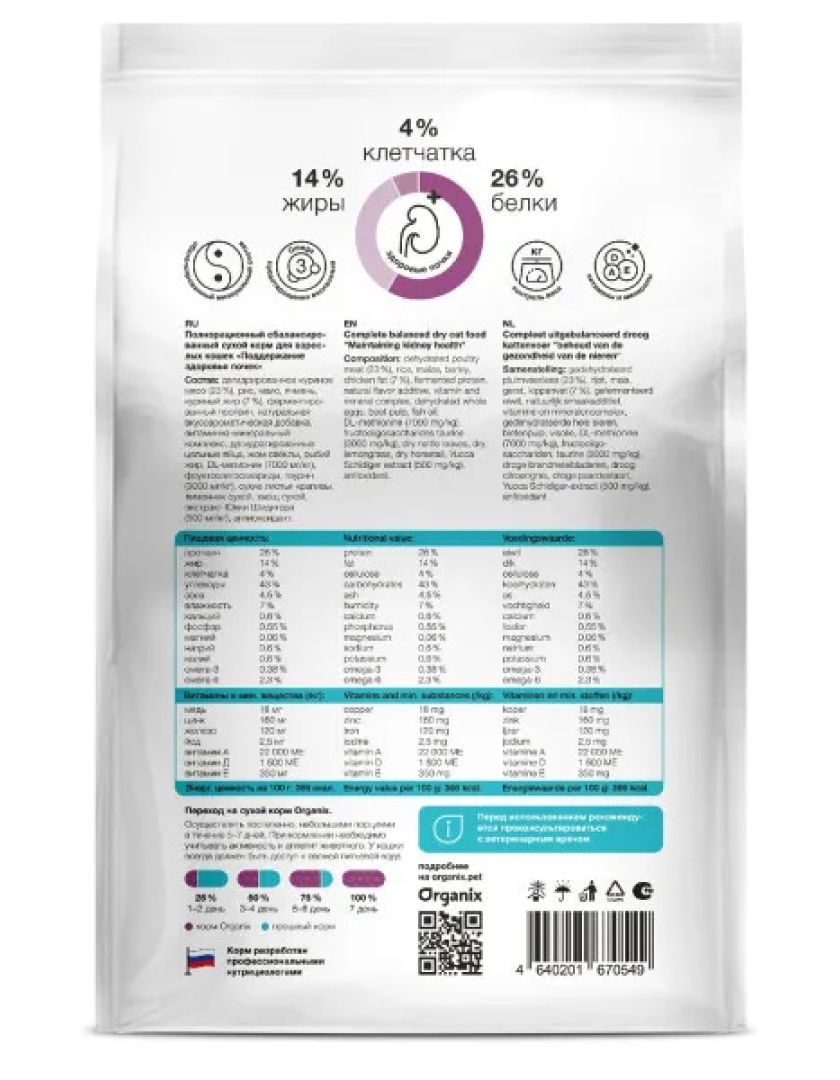 Полнорационный сбалансированный сухой корм для кошек Organix Renal – это диетический корм для профилактики почечной недостаточности и ее осложнений у взрослых кошек