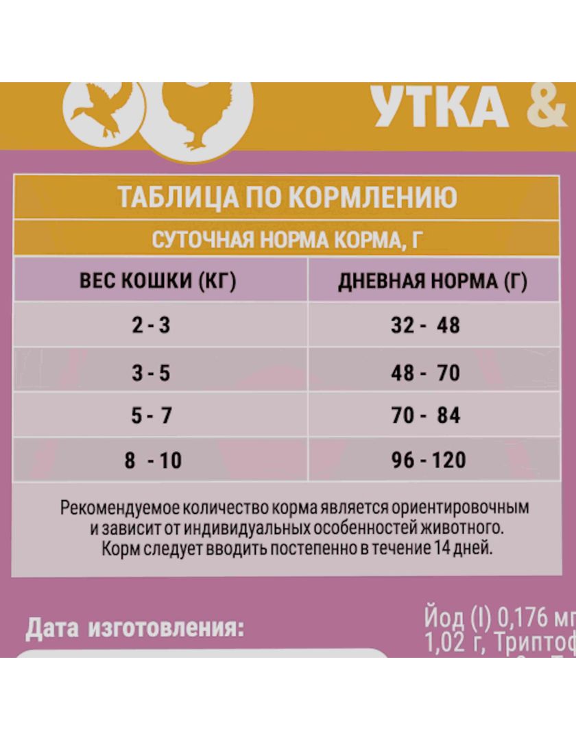 Дегидрированное мясо 35 % (курица, утка), маис цельнозерновой, белок растительный кукурузный, рис цельнозерновой, мясной соус и дегидратированная печень 4 %, жир куриный (источник Омега-6 жирных кислот), пульпа свекольная, меланж сухой яичный, дрожжи (источник маннанолигосахаридов), хлорид калия, плазма крови сухая, витаминно-минеральный комплекс, жир океанической рыбы (источник Омега-3 жирных кислот), таурин, ягоды дикой клюквы (источник органических кислот, профилактирующих МКБ), тыква, малина, DL-Метионин, антиоксидант (в том числе экстракт розмарина и токоферолы), топинамбур (источник ФОС), тимьян, комплекс пробиотиков (Bacillus subtilis, Bacillus licheniformis), комплекс бета-глюканов и МОС, экстракт фукуса (морская бурая водоросль), экстракт юкки шидигера.