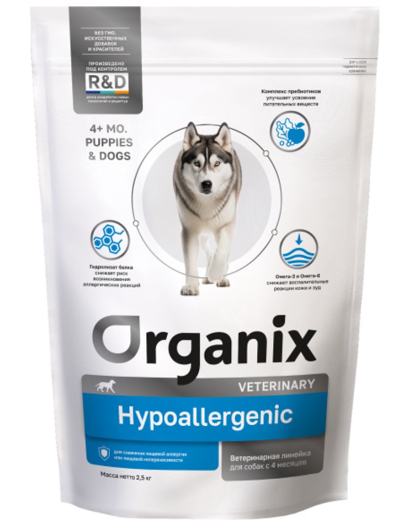 Полнорационный сухой корм Organix Veterinary Hypoallergenic - это диетическое питание для собак для снижения пищевой непереносимости ингредиентов и питательных веществ. Особенности: использование гидролизованного белка с низкой молекулярной массой помогает снизить риск аллергических реакций; высокая концентрация незаменимых жирных кислот (линолевая кислота, эйкозапентаеновая кислота (EPA) и докозагексаеновая кислота (DHA)) способствует максимальному усилению естественных противовоспалительных процессов; цинк и витамин Е способствуют защите клеток от повреждения и регенерации тканей; тщательно отобранные источники углеводов помогают минимизировать возможность проявления аллергических реакций; комплекс пребиотиков улучшает усвоение питательных веществ и укрепляет иммунную систему. Противопоказания: панкреатит; беременность; период лактации.