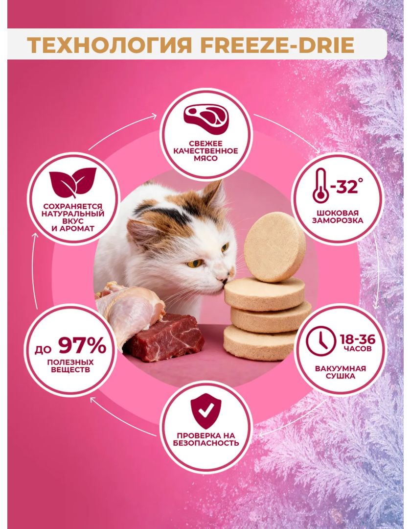 Полнорационный сублимированный корм для кошек с курицей – это идеальный выбор для заботливых владельцев, стремящихся обеспечить своим питомцам здоровое и сбалансированное питание, максимально приближенное к естественному рациону