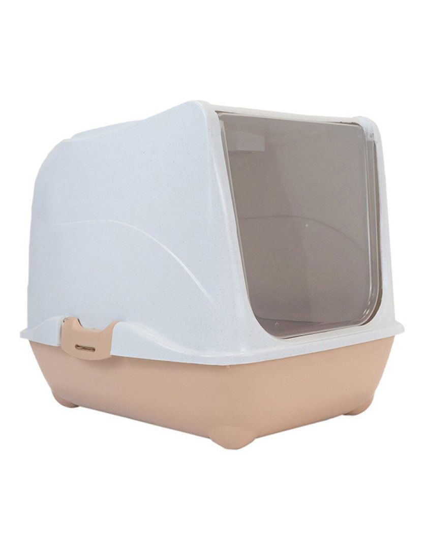 Полупрозрачная откидная дверца легко открывается в обе стороны, помогает удерживать запахи внутри и уменьшает разбрасывание наполнителя, когда кошка активно закапывает.