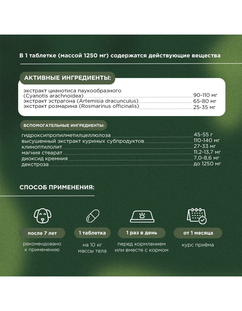 В 1 таблетке (массой 1250 мг) содержатся действующие вещества: экстракт цианотиса паукообразного (Cyanotis arachnoidea) – 90-110 мг, экстракт розмарина (Rosmar?nus officin?lis) – 25-35 мг, экстракт эстрагона (Artem?sia drac?nculus) – 65-80 мг;