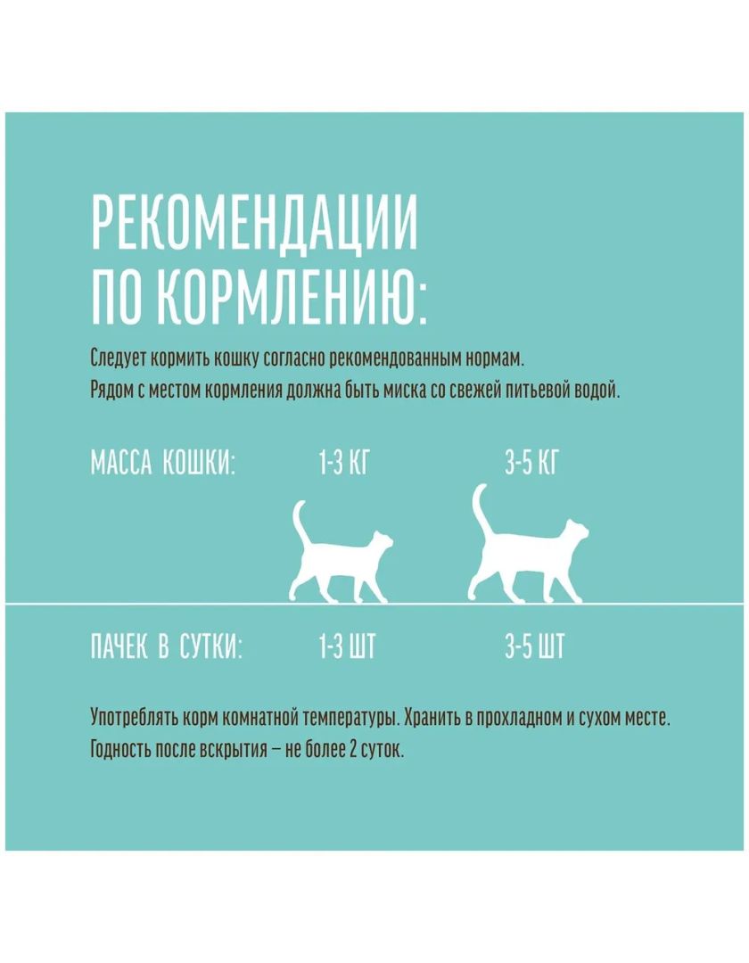 . Подаётся в нежном желе, которое не только улучшает текстуру корма, но и способствует лучшему усвоению питательных веществ. Дополнительный (неполнорационный) корм для кошек.
