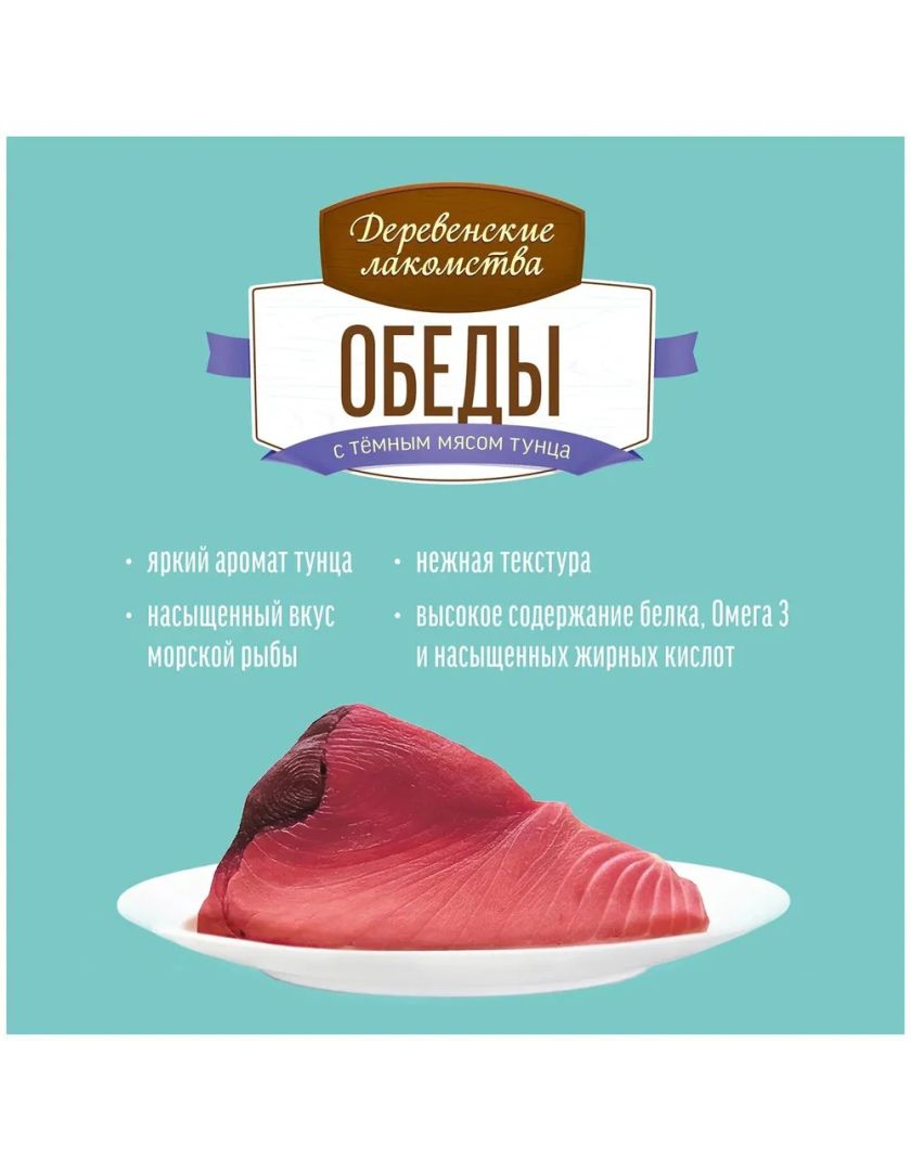 Консервированный влажный корм для кошек серии «Деревенские лакомства — Рыбные обеды» содержит большое количество мяса тихоокеанского тунца, чей вкус идеально сочетается со вкусом нежного куриного филе.