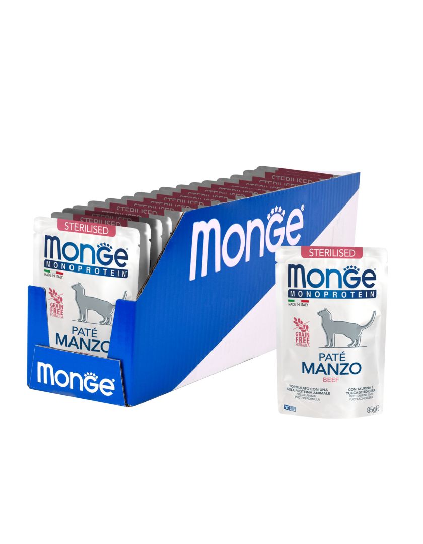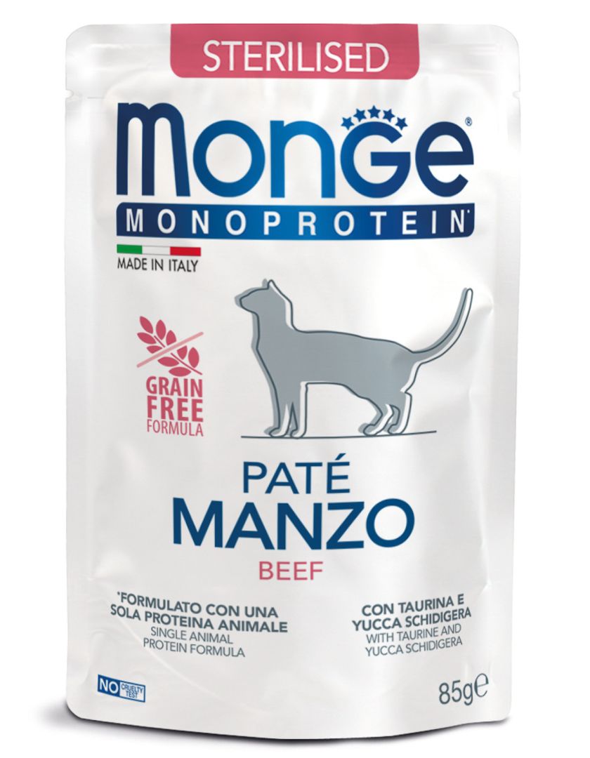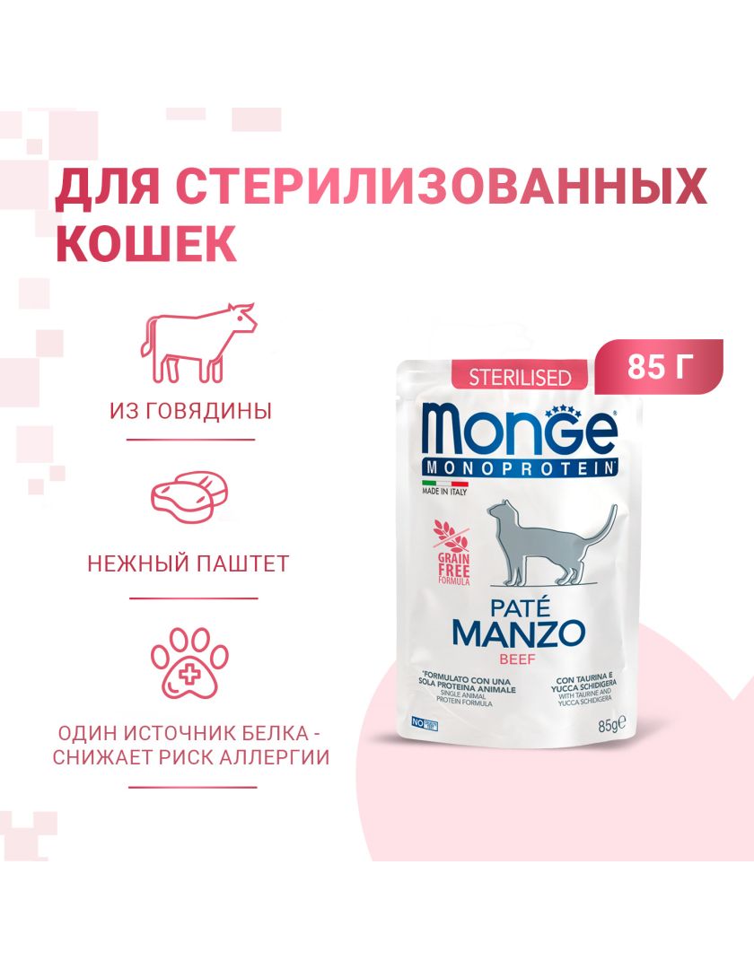 Monge (Монж) Cat Speciality Line Monoprotein полнорационные беззерновые паучи из мяса говядины для стерилизованных кошек и кастрированных котов 85 г.