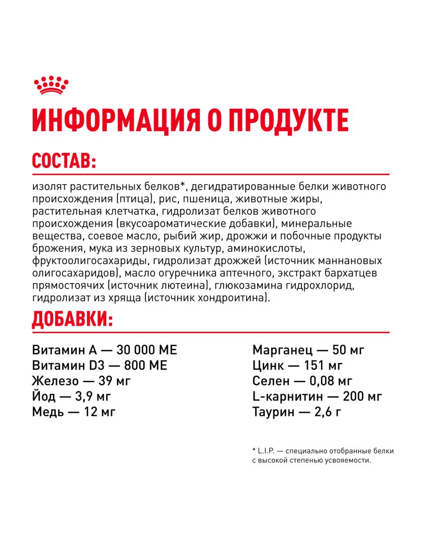 ИНГРЕДИЕНТЫ: изолят растительных белков*, дегидратированные белки животного происхождения (птица), рис, пшеница, животные жиры, растительная клетчатка, гидролизат белков животного происхождения (вкусоароматические добавки), минеральные вещества, соевое масло, рыбий жир, дрожжи и побочные продукты брожения, мука из зерновых культур, аминокислоты, фруктоолигосахариды, гидролизат дрожжей (источник маннановых олигосахаридов), масло огуречника аптечного, экстракт бархатцев прямостоячих (источник лютеина), глюкозамина гидрохлорид, гидролизат из хряща (источник хондроитина).