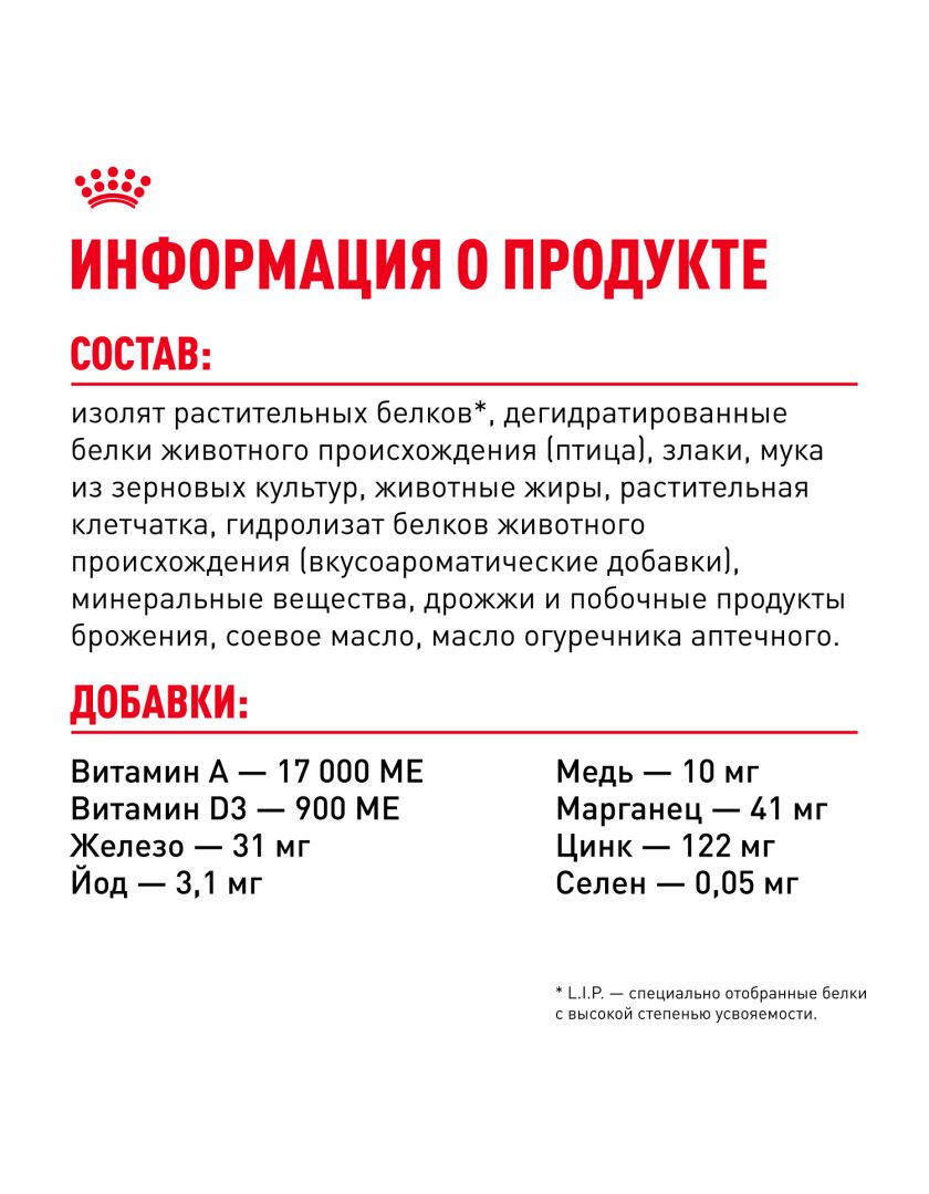 ИНГРЕДИЕНТЫ: изолят растительных белков*, дегидратированные белки животного происхождения (птица), злаки, мука из зерновых культур, животные жиры, растительная клетчатка, гидролизат белков животного происхождения (вкусоароматические добавки), минеральные вещества, дрожжи и побочные продукты брожения, соевое масло, масло огуречника аптечного .